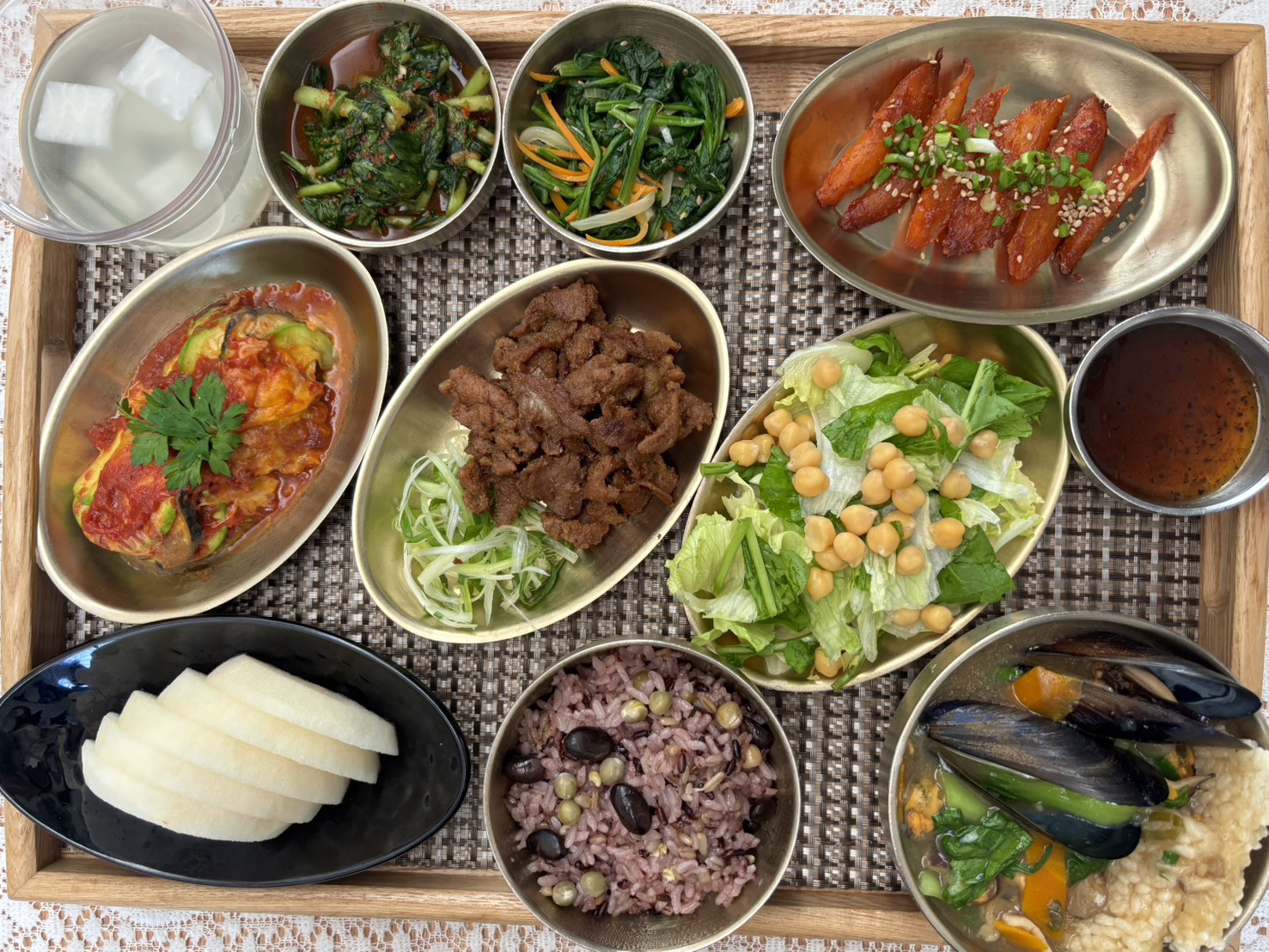 잡곡밥/영양죽/해물누룽지탕/제육간장바싹불고기/더덕양념구이/시금치나물/라따뚜이/병아리콩샐러드&드레싱/열무김치/나박김치/계절과일
