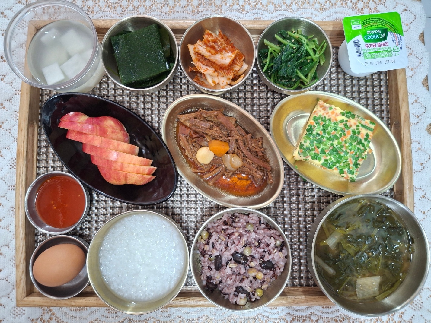 잡곡밥/죽/시금치된장국/한우장조림/야채계란찜/쌈다시마&초장/취나물/포기김치/나박김치/사과/계란/요거트
