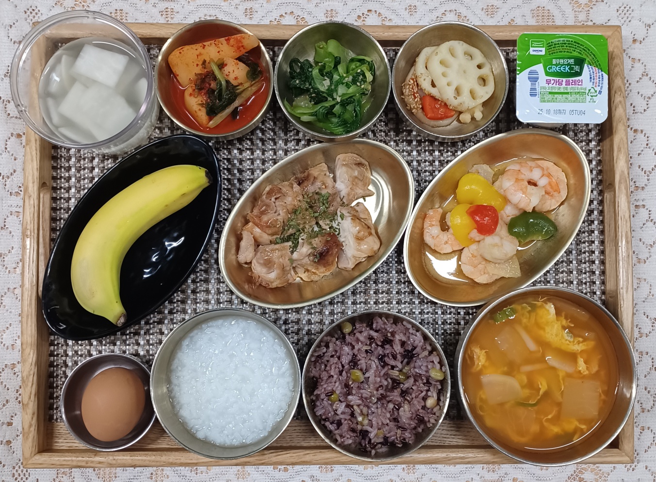 잡곡밥/죽/황태무국/가오리찜&양념장/새우살볶음/청경채나물/연근유자무침/알타리김치/나박김치/바나나/계란/요거트