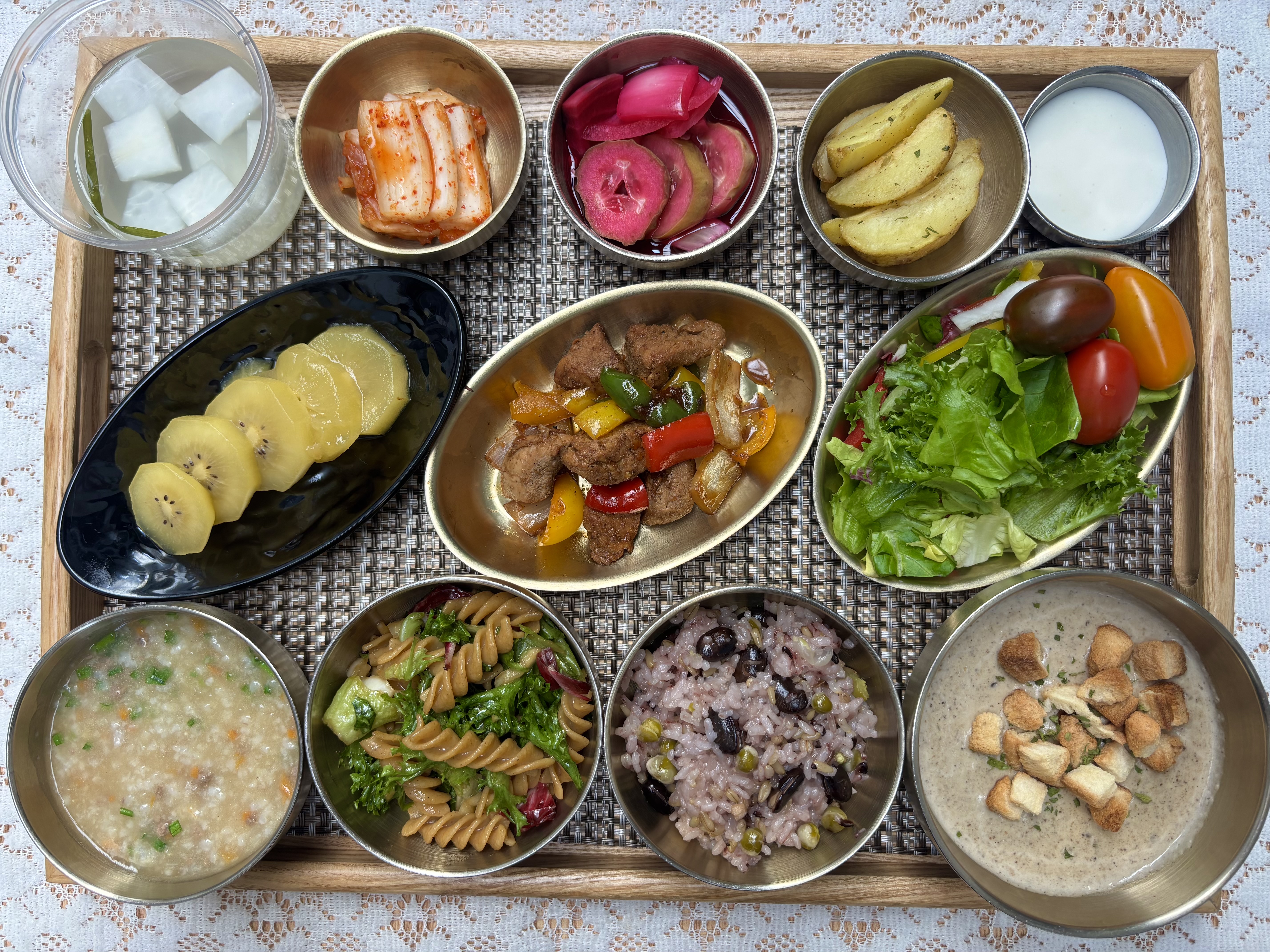 잡곡밥/영양죽/양송이스프/돈안심찹스테이크/통곡물푸실리파스타/감자구이/수제피클/엔다이브샐러드&드레싱/포기김치/나박김치/계절과일