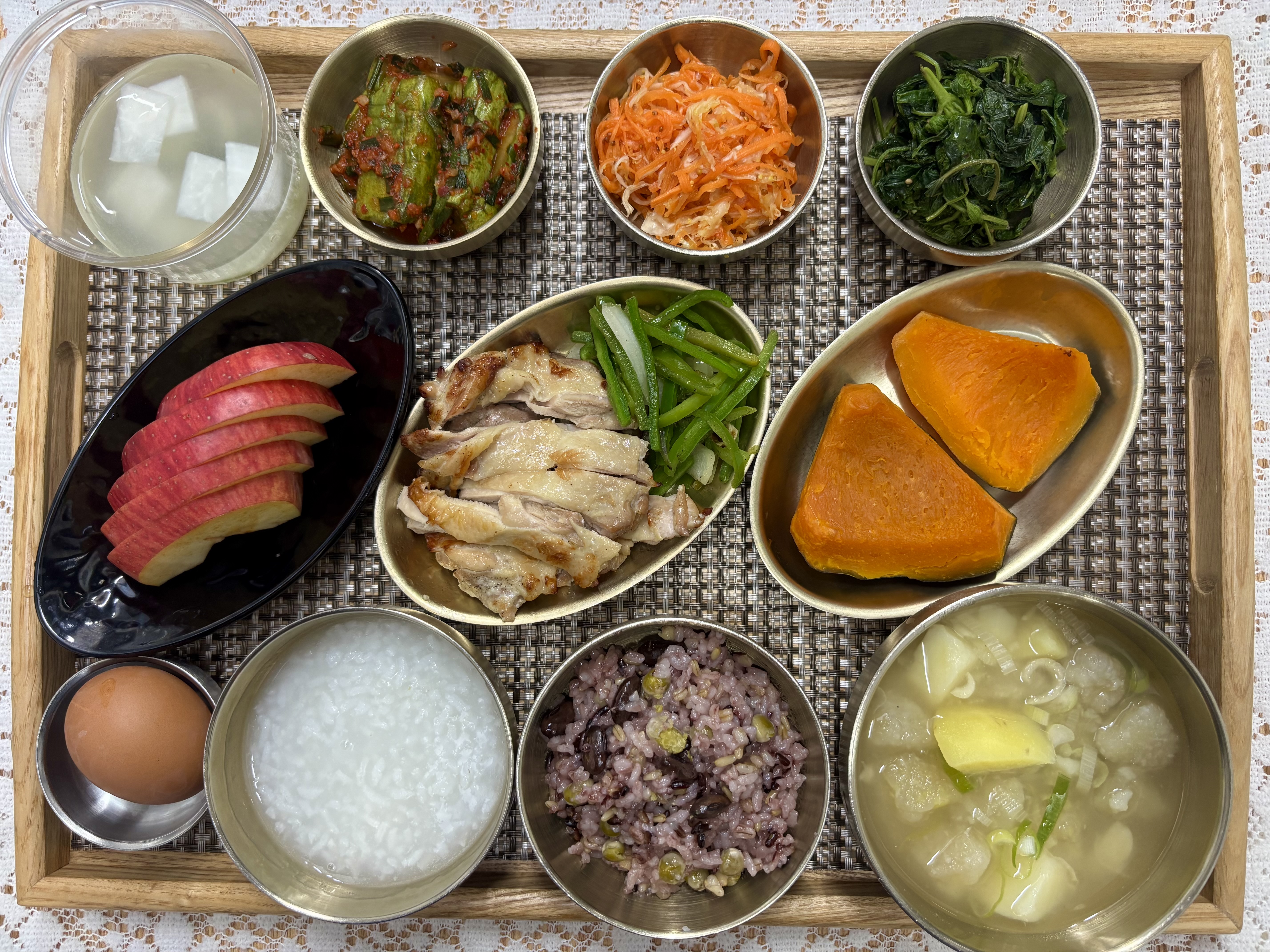 잡곡밥/죽/감자옹심이국/닭다리살구이/단호박찜/깻순나물/당근라페/오이소박이/나박김치/사과/계란/요거트
