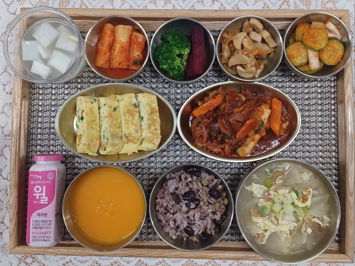 잡곡밥/영양죽/황태국/오리주물럭/계란말이/새송이버섯볶음/오이무침/석박지/나박김치/숙비트&숙브로컬리/저지방윌