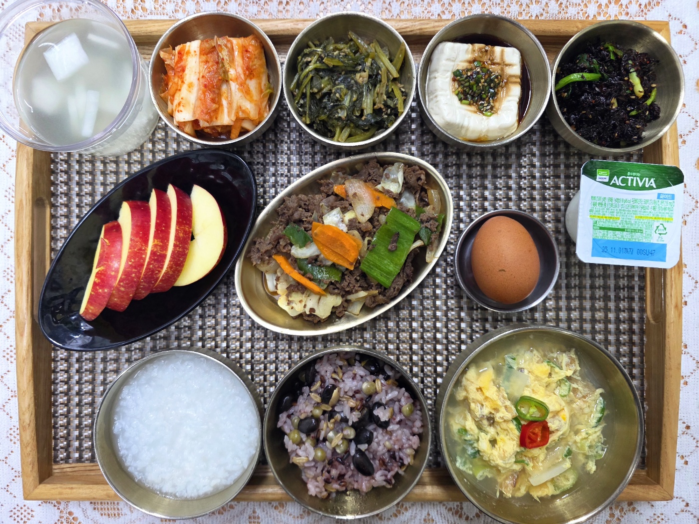 잡곡밥/죽/황태무국/한우불고기/연두부&간장/건파래무침/열무된장나물/포기김치/나박김치/사과/계란/요거트