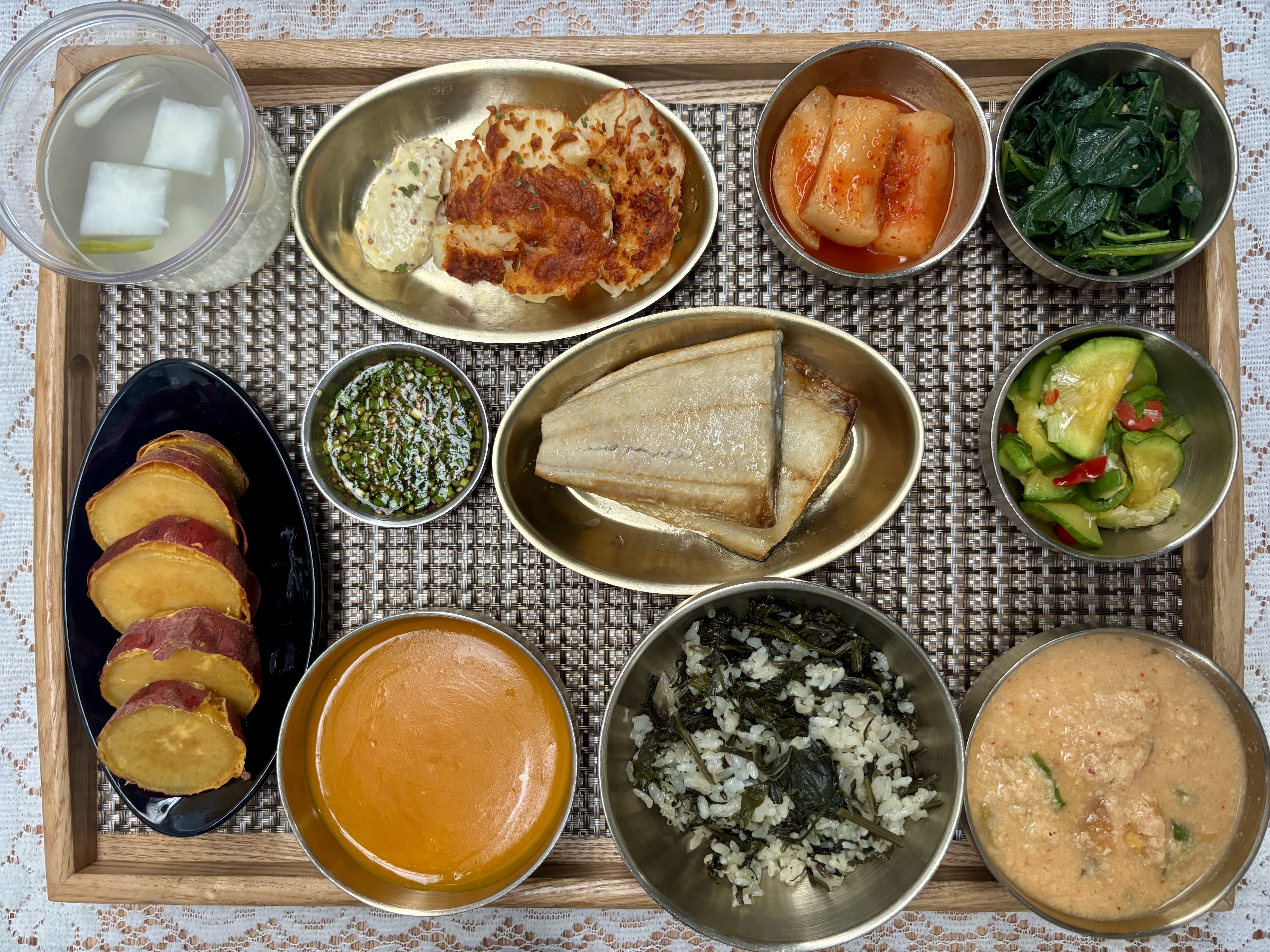 잡곡밥/콩비지찌개/곤드레밥&양념장/임연수구이/애호박볶음/취나물/석박지/감자구이&소스/고구마