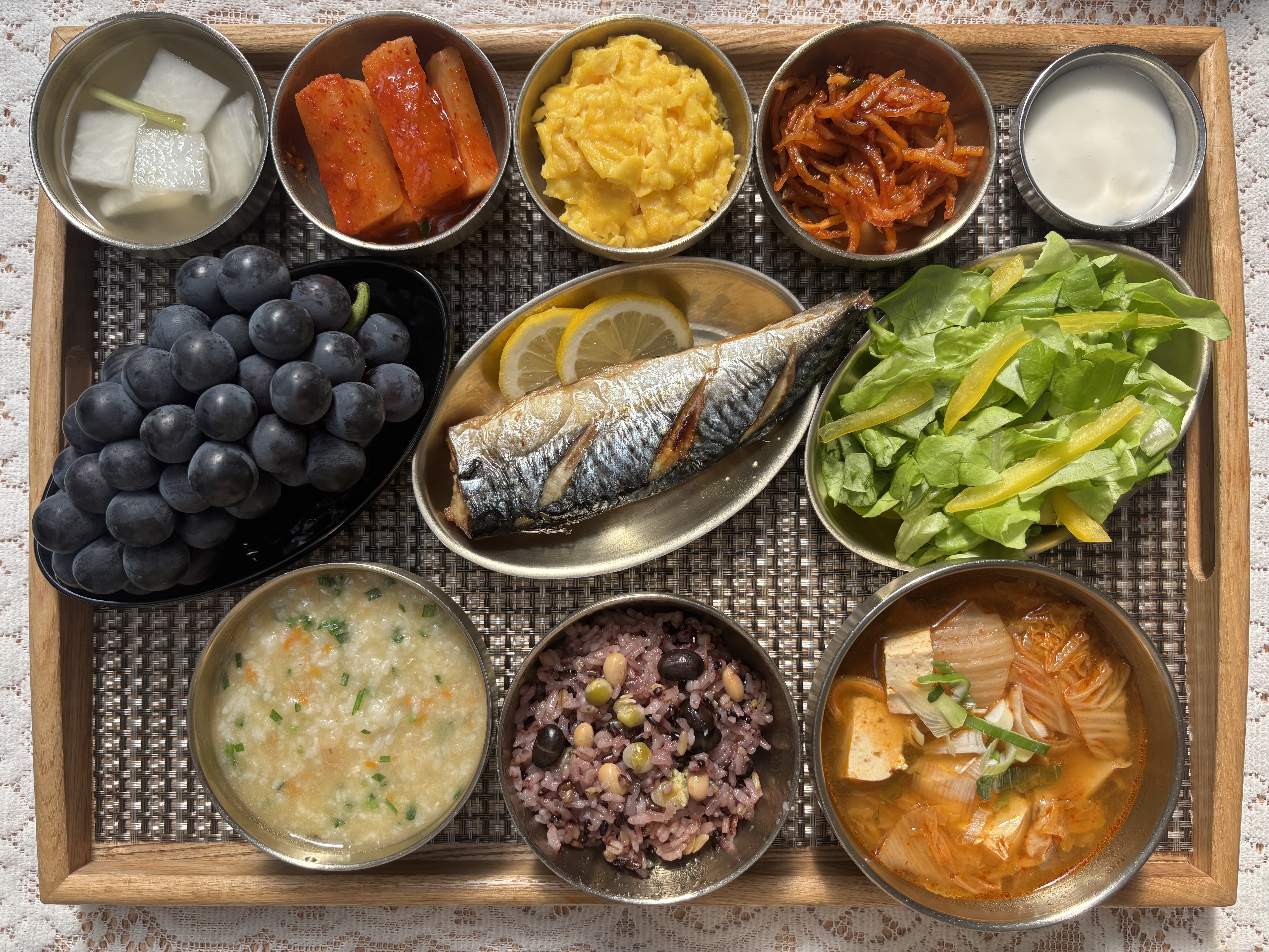 잡곡밥/영양죽/김치찌개/고등어구이/스크램블에그/진미채볶음/참나물들기름무침/버터헤드샐러드&드레싱/석박지/나박김치/계절과일