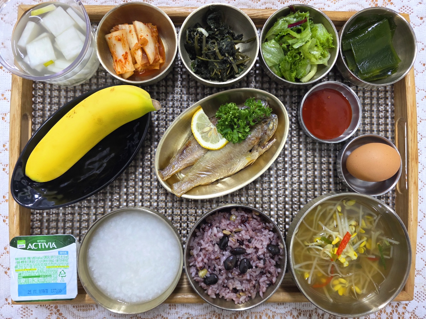 잡곡밥/죽/콩나물국/굴비구이/쌈다시마&초장/건곤드레나물/쌈채소무침/포기김치/나박김치/바나나/계란/요거트