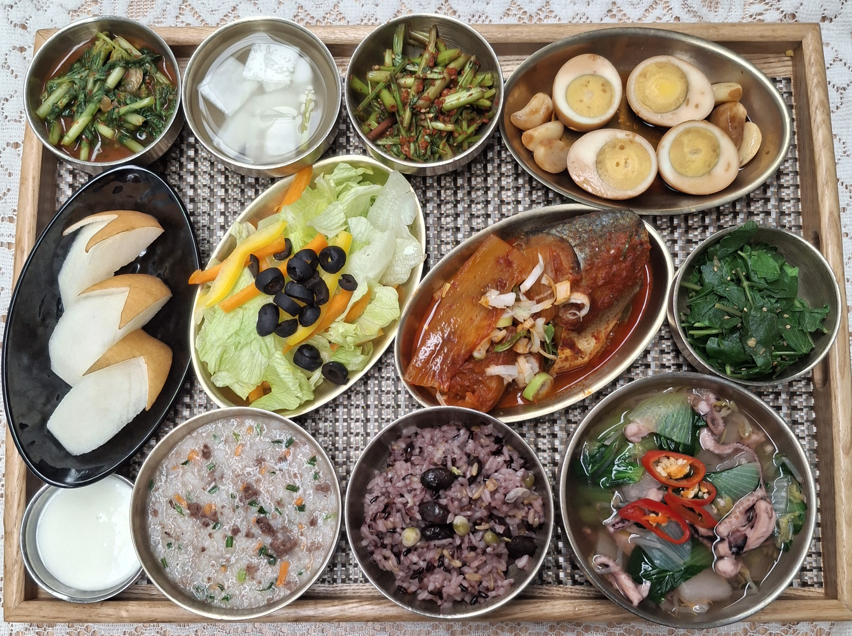 잡곡밥/영양죽/연포탕/묵은지고등어조림/계란장조림/방풍된장나물/미나리생채/올리브샐러드&드레싱/열무김치/나박김치/계절과일