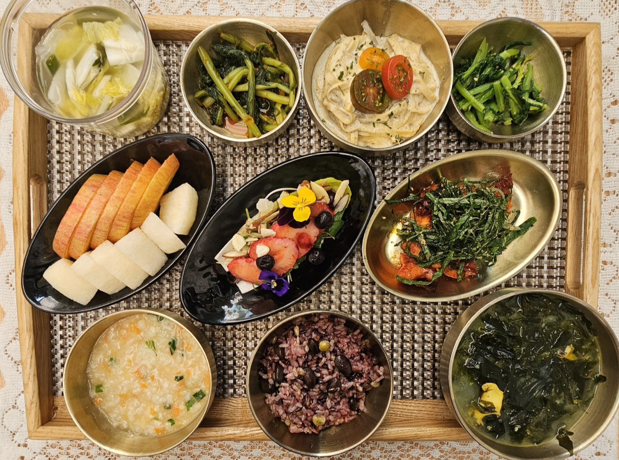 잡곡밥/영양죽/전복미역국/고추장닭구이/우엉채두부면들깨파스타/도라지오이무침/열무된장지짐/앤다이브딸기샐러드&드레싱/열무김치/나박김치/컵과일