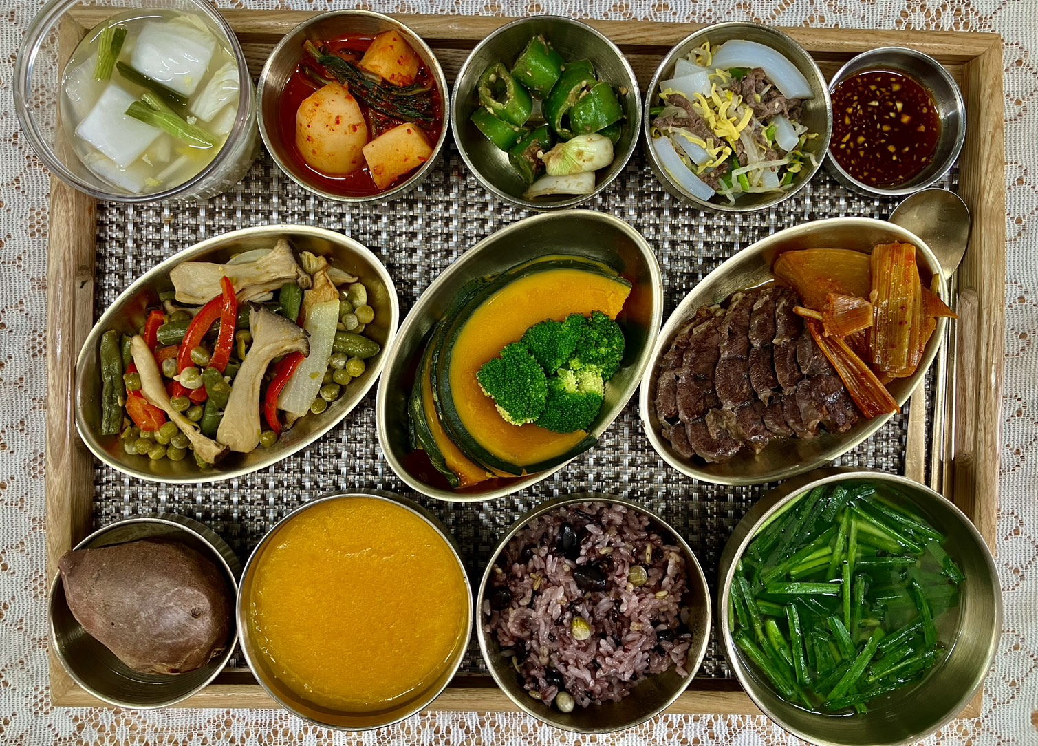 잡곡밥/영양죽/나주곰탕&소스/사태양념무조림/그린빈완두콩볶음/탕평채/아삭이고추된장무침/알타리김치/나박김치/야채찜(브로컬리&컬리)/초장/군고구마