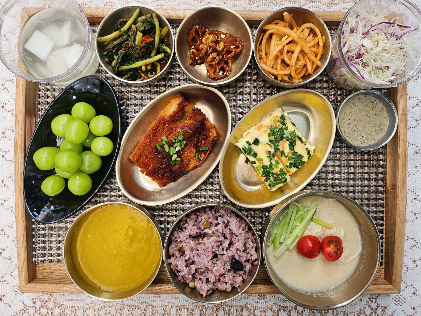 잡곡밥/영양죽/두유면콩국수/황태구이/계란찜/연근호두조림/무생채/양배추샐러드&드레싱/열무김치/나박김치/계절과일