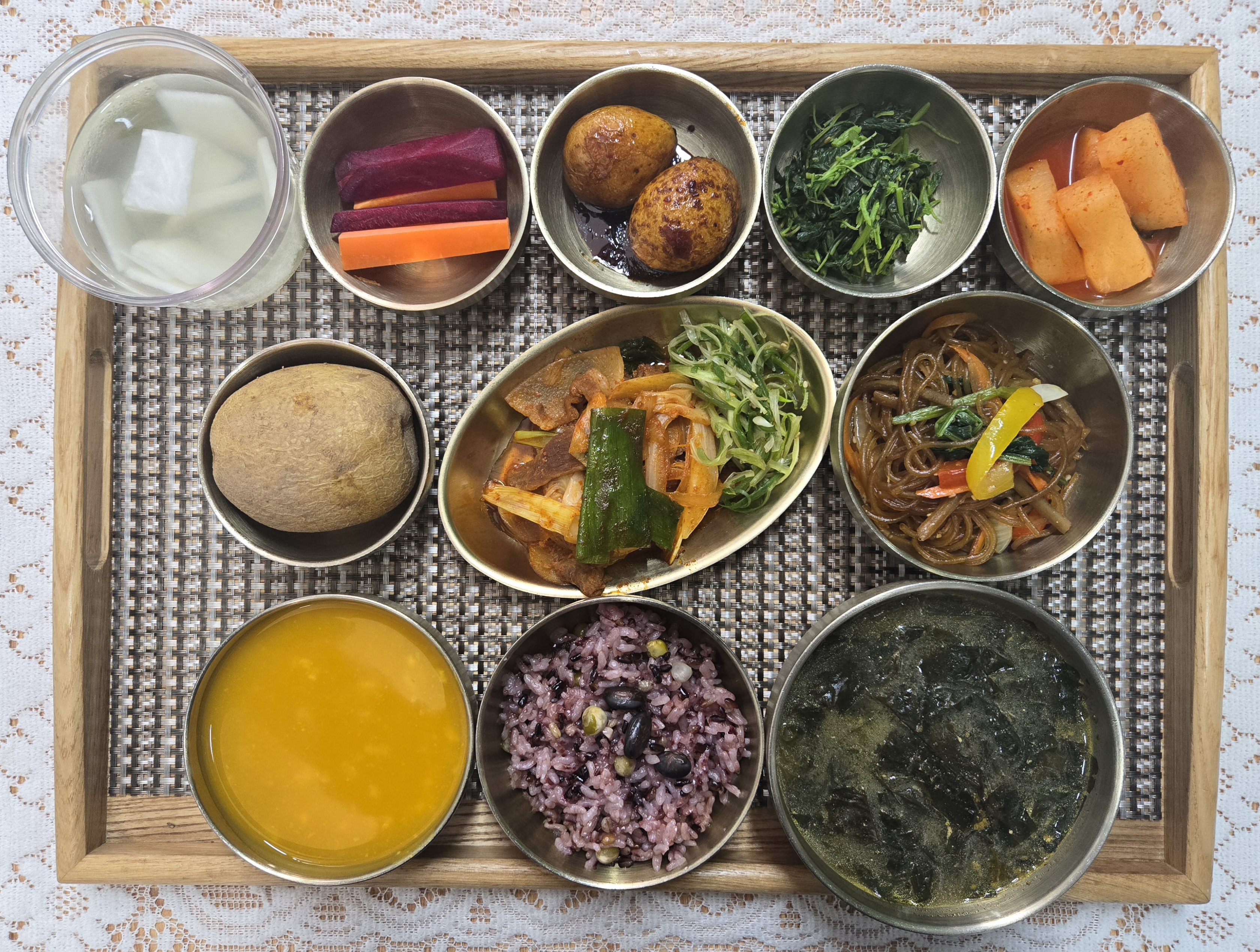 잡곡밥/영양죽/들깨미역국/제육파채두루치기/우엉잡채/비름나물/알감자조림/석박지/나박김치/모듬야채(당근&비트)/찐감자