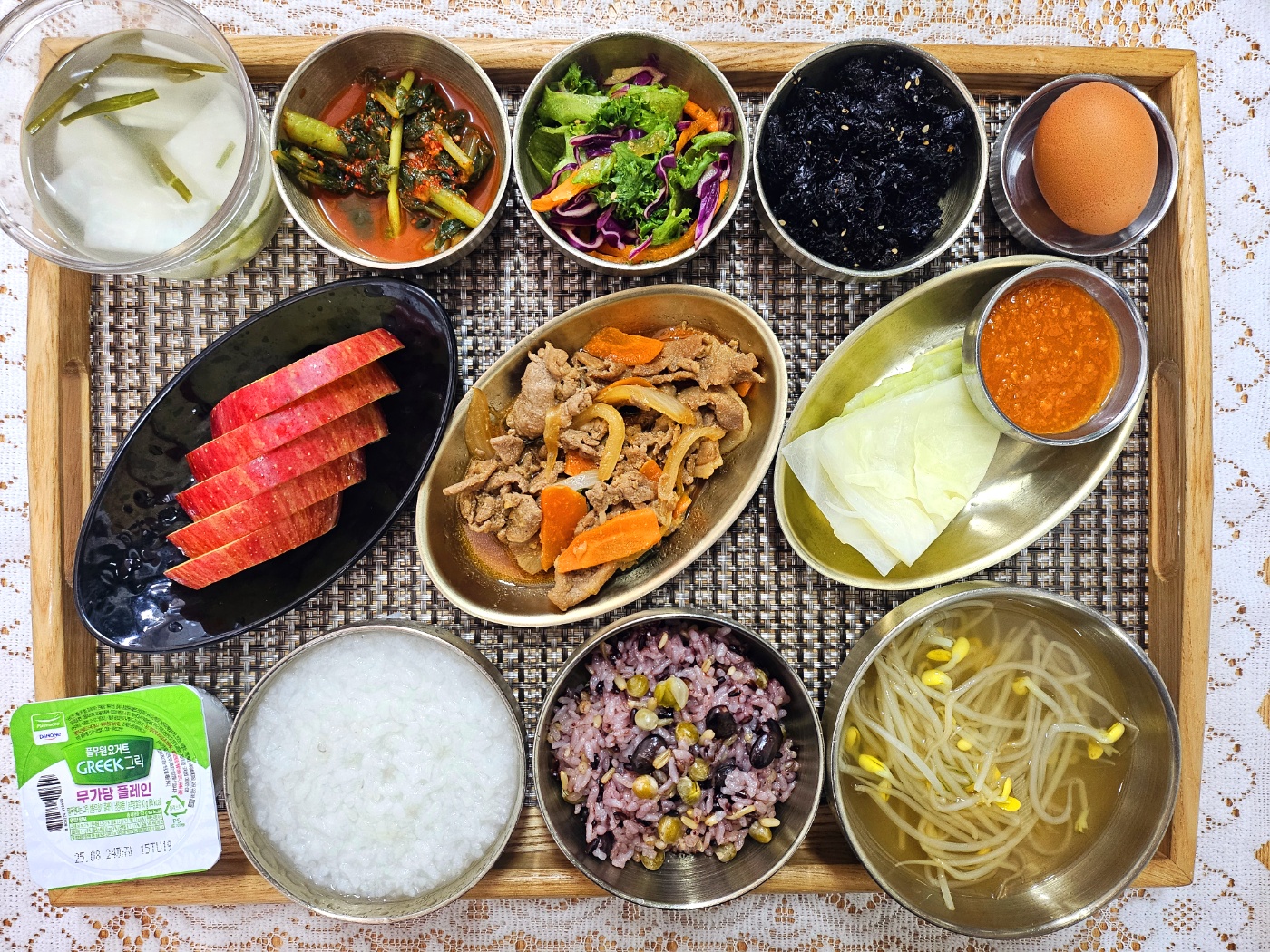 잡곡밥/죽/콩나물국/돼지불고기/양배추찜&쌈장/건파래무침/쌈채소겉절이/열무김치/나박김치/누룽지/사과/찐계란/그릭요거트
