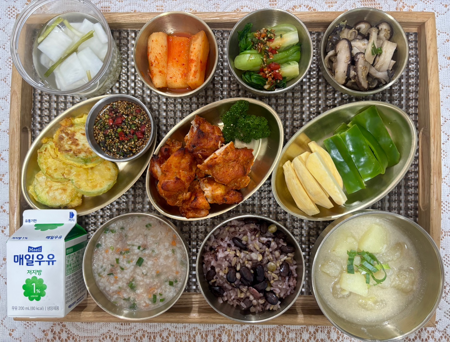 잡곡밥/영양죽/감자옹심이들깨탕/매콤닭구이/애호박전/모듬버섯볶음/청경채찜/석박지/나박김치/생고구마&청피망/저지방우유