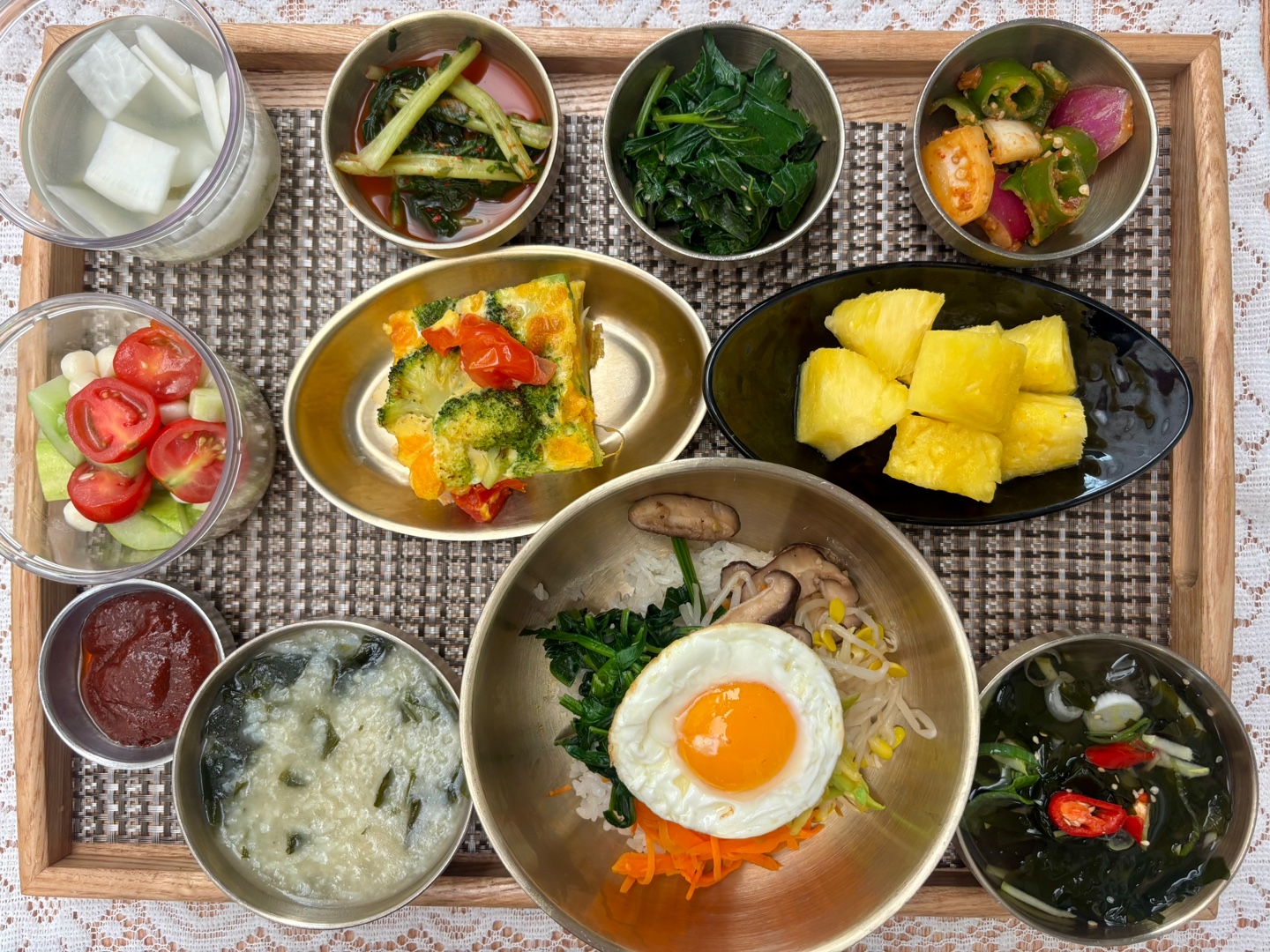 잡곡밥/영양죽/오이냉국/비빔밥/감자프리타타/아삭이된장무침/곰취나물/지중해식샐러드/열무김치/나박김치/계절과일