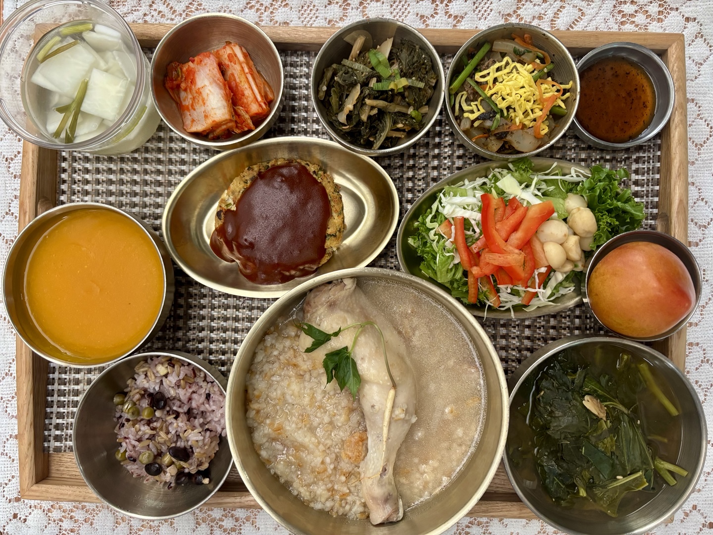 잡곡밥(소량)/영양죽/바지락아욱된장국/닭장각누룽지탕/채식함박스테이크/탕평채/시래기지짐/견과류샐러드&드레싱/포기김치/나박김치/계절과일