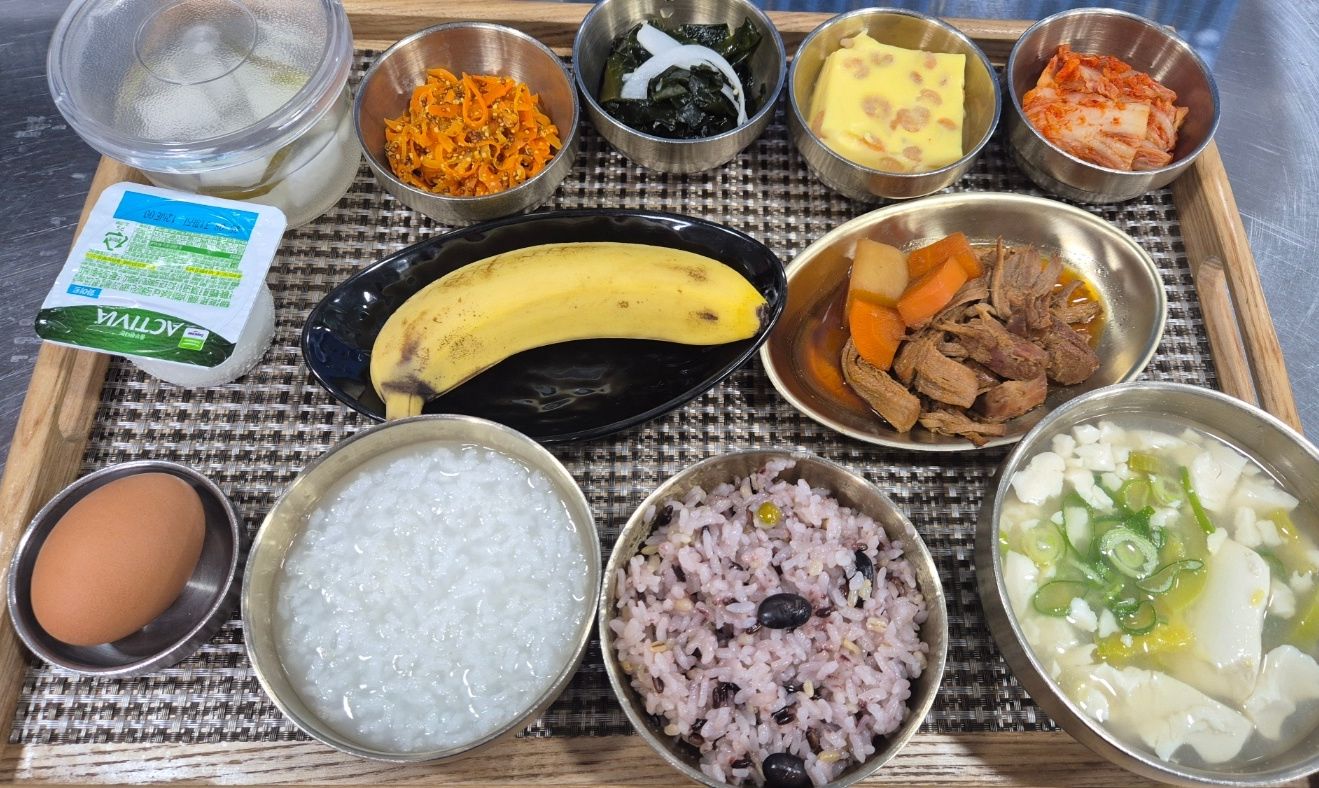잡곡밥/죽/애호박새우젓국/돈안심장조림/새우계란찜/미역초무침/당근라페/포기김치/나박김치/누룽지/바나나/찐계란/요거트