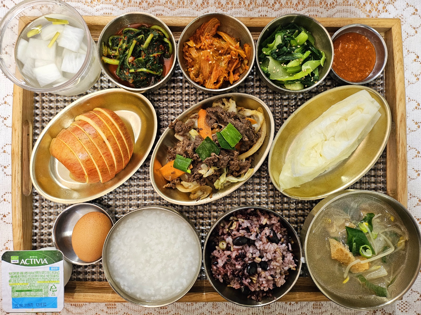 잡곡밥/죽/북어해장국/한우불고기/묵은지지짐/양배추쌈&쌈장/청경채나물/열무김치/나박김치/누룽지/사과/계란/요거트