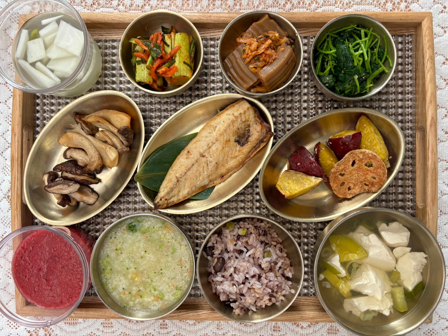 잡곡밥/영양죽/순두부백탕/고등어구이/구운고구마저당맛탕/참나물무침/도토리묵김치무침/갓김치/나박김치/모듬버섯구이(머쉬마루&표고버섯)/비트쥬스