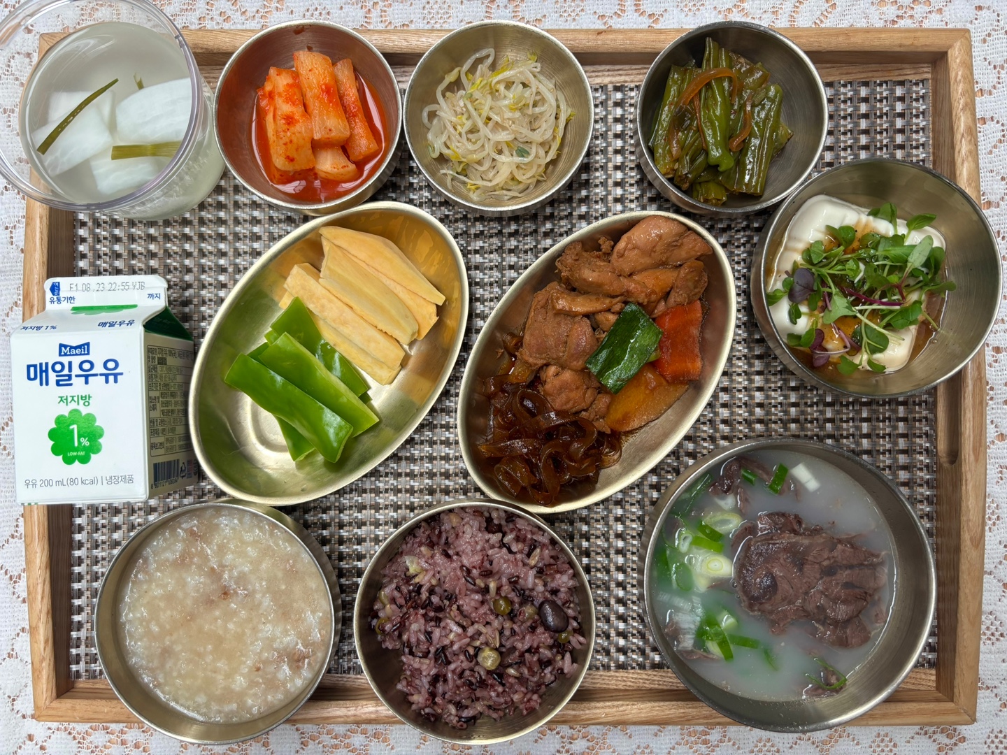 잡곡밥/영양죽/설렁탕/찜닭/연두부&새싹채소/꽈리고추찜/숙주나물/석박지/나박김치/생고구마&청피망/저지방우유