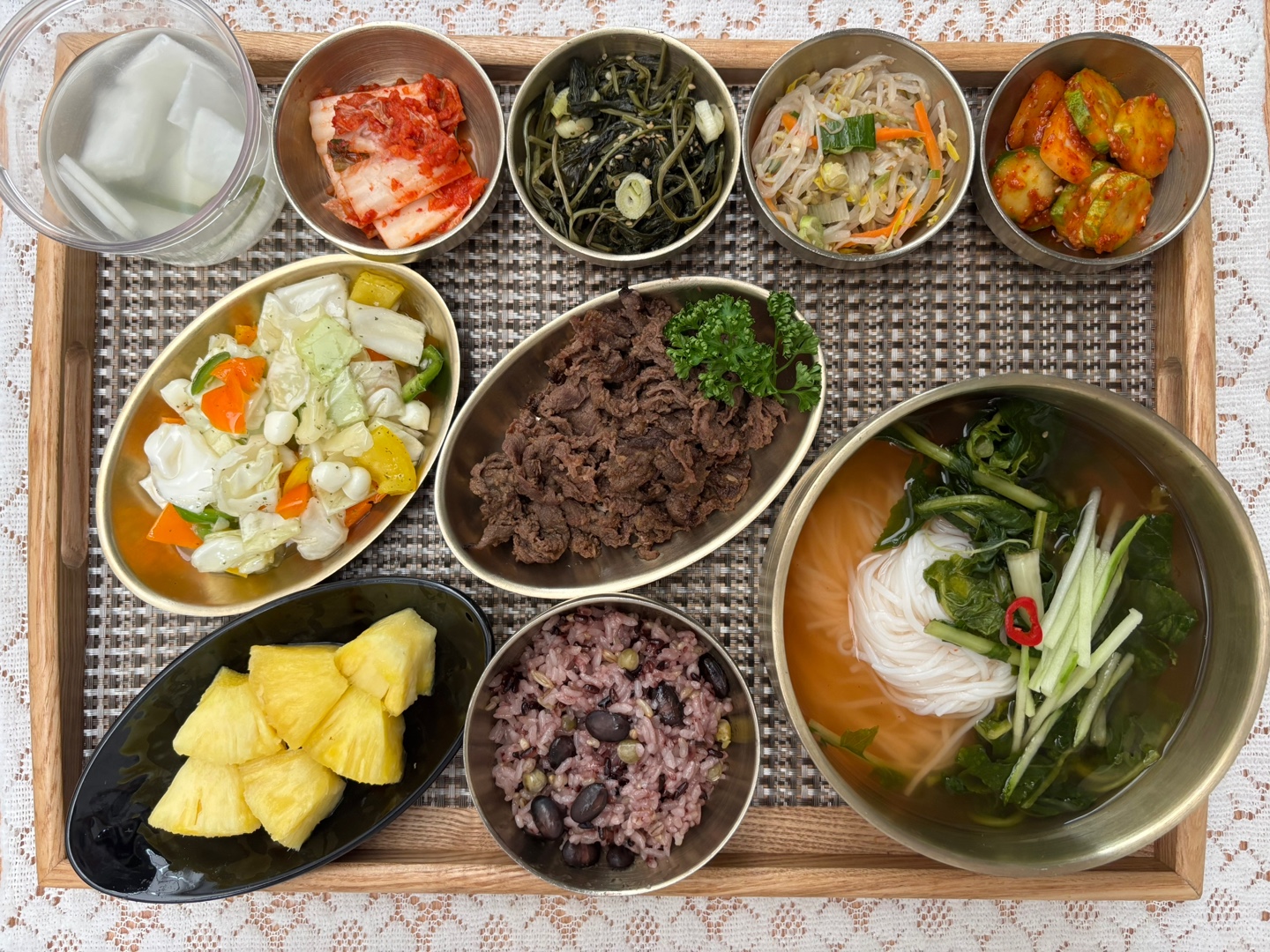 잡곡밥/영양죽/쌀소면열무김치국수/바싹소불고기/숙주나물/건취나물볶음/오이무침/보코치니샐러드/포기김치/나박김치/계절과일