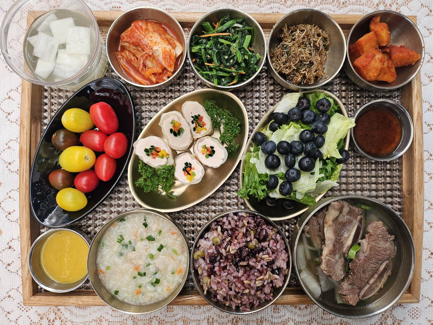 잡곡밥/영양죽/갈비탕/닭가슴살양배추롤&연겨자/감자조림/잔멸치볶음/시금치나물/블루베리샐러드&드레싱/포기김치/나박김치/계절과일