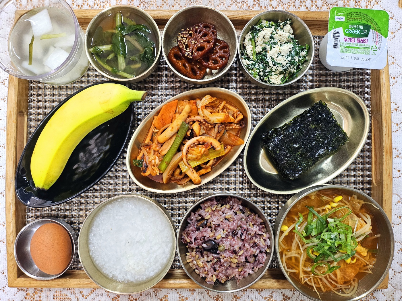 잡곡밥/죽/김치콩나물국/오징어볶음/연근조림/쑥갓두부무침/구운김/석박지/나박김치/누룽지/바나나/계란/요거트