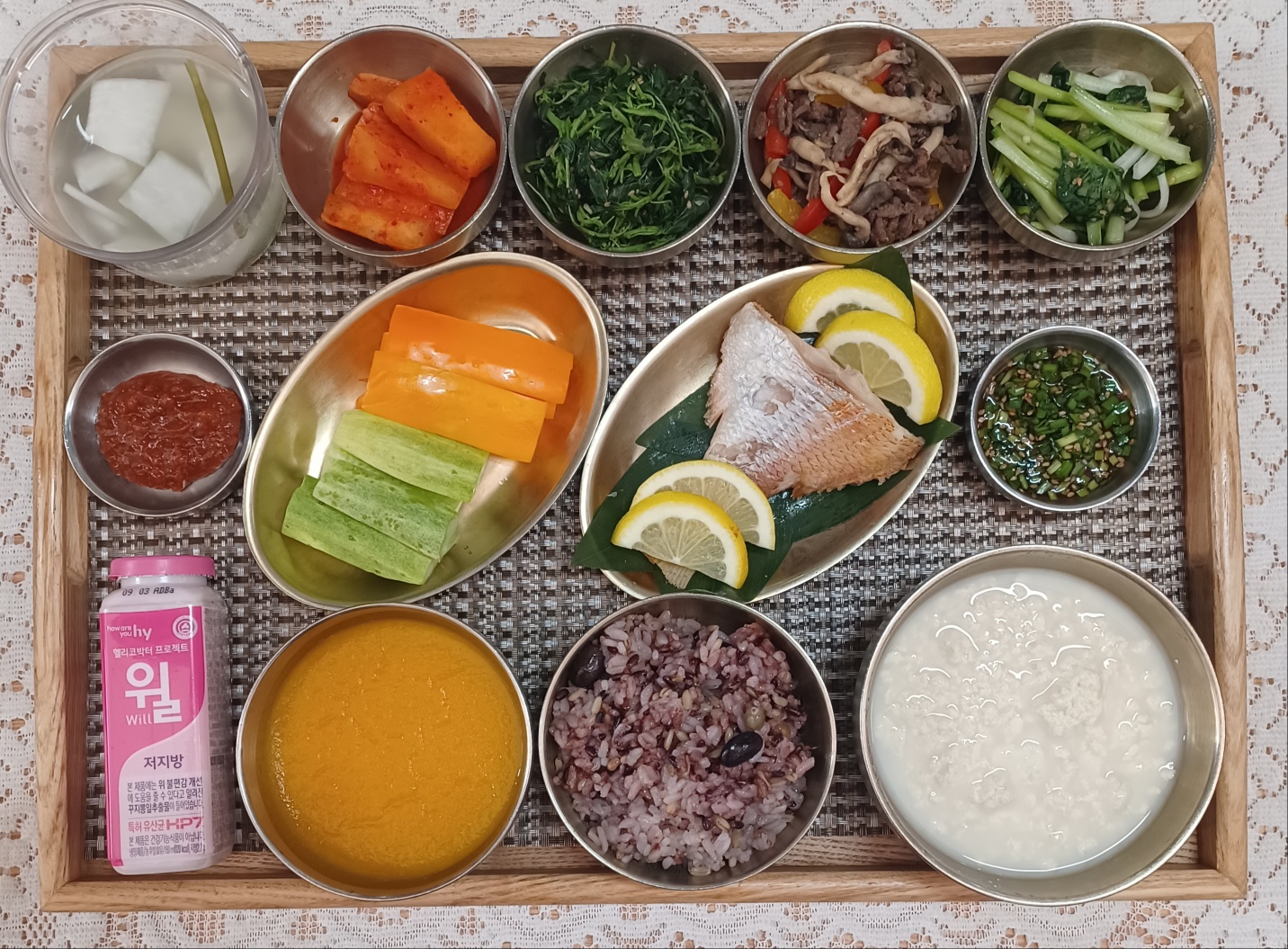 잡곡밥/영양죽/초당두부&양념장/제주옥돔구이/우채애느타리볶음/비름나물/비타민유자무침/석박지/나박김치/파프리카&생오이*쌈장/저지방윌