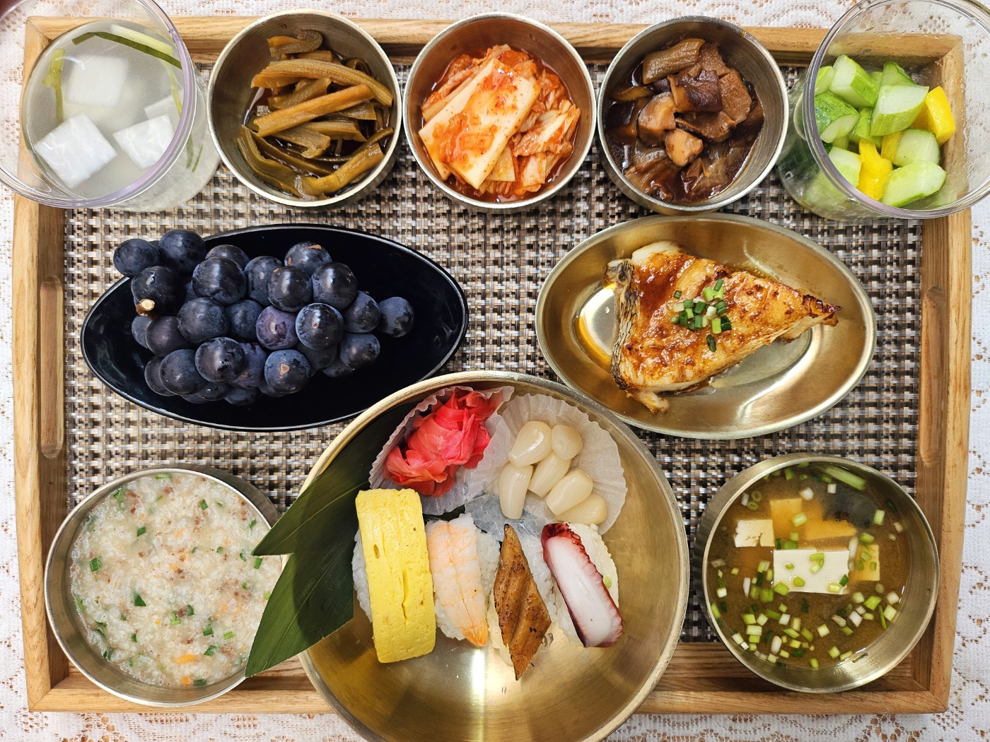 잡곡밥/영양죽/미소장국/초밥/메로구이/표고버섯조림/궁채장아찌/여름오이샐러드/포기김치/나박김치/계절과일