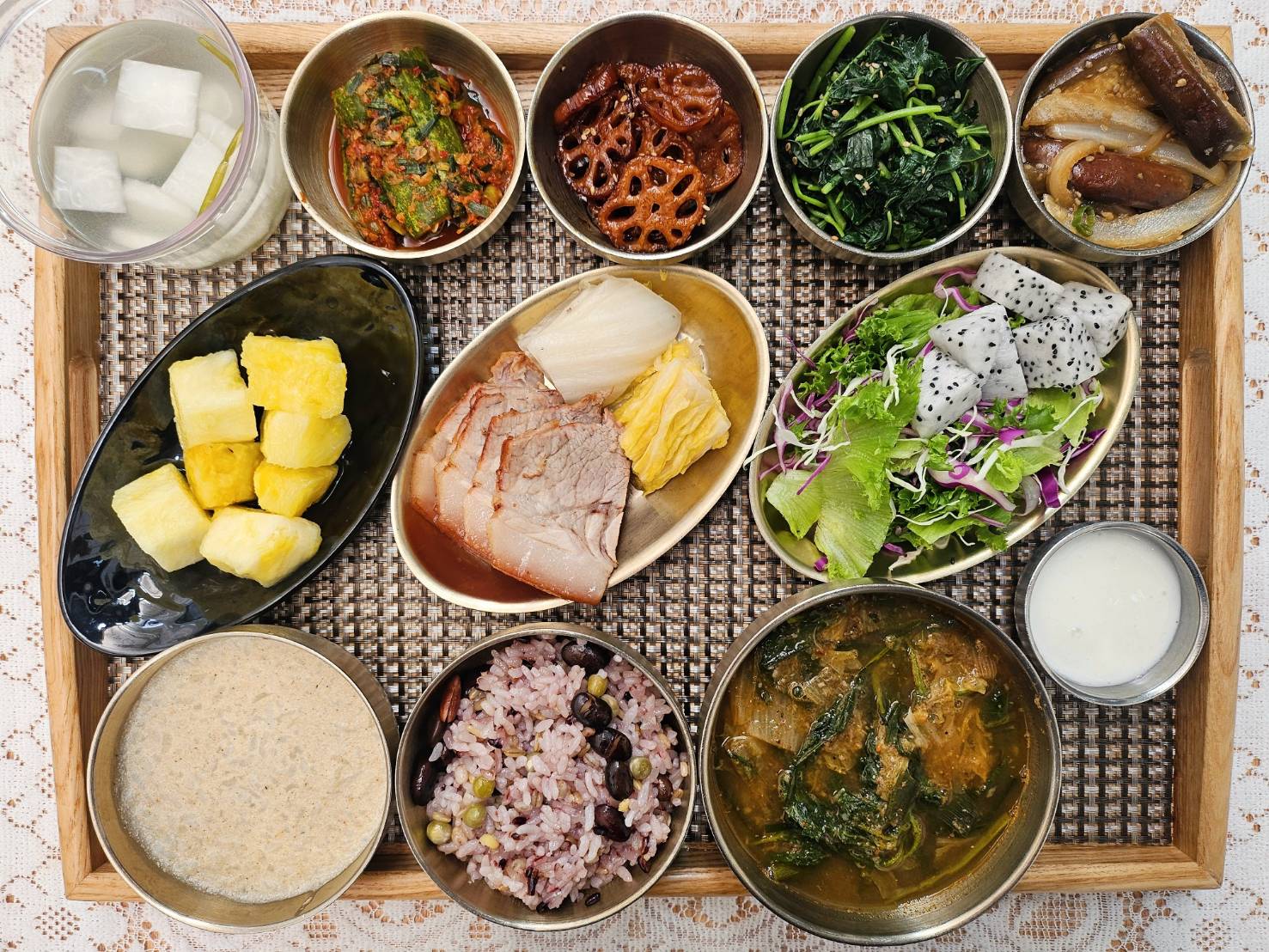 잡곡밥/영양죽/추어탕/보쌈&백묵은지/가지나물/연근조림/참나물/용과샐러드&드레싱/오이소박이/나박김치/계절과일