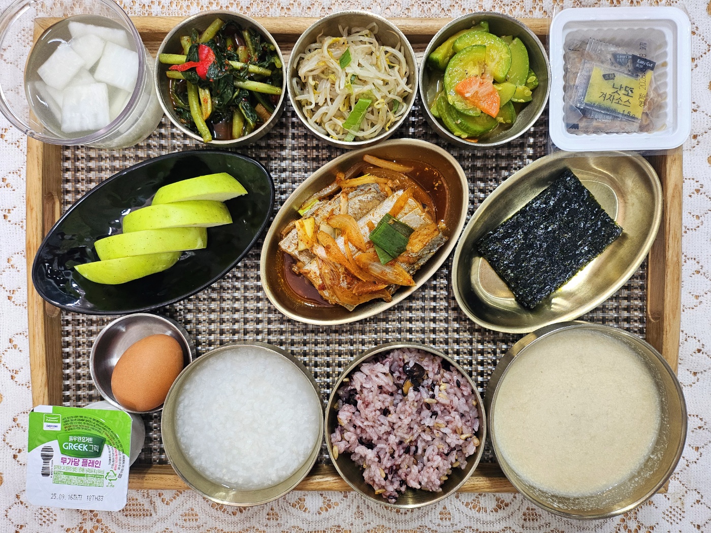 잡곡밥/죽/콩비지백탕/갈치조림/낫또&김/애호박나물/숙주나물/열무김치/나박김치/누룽지/사과/계란/요거트