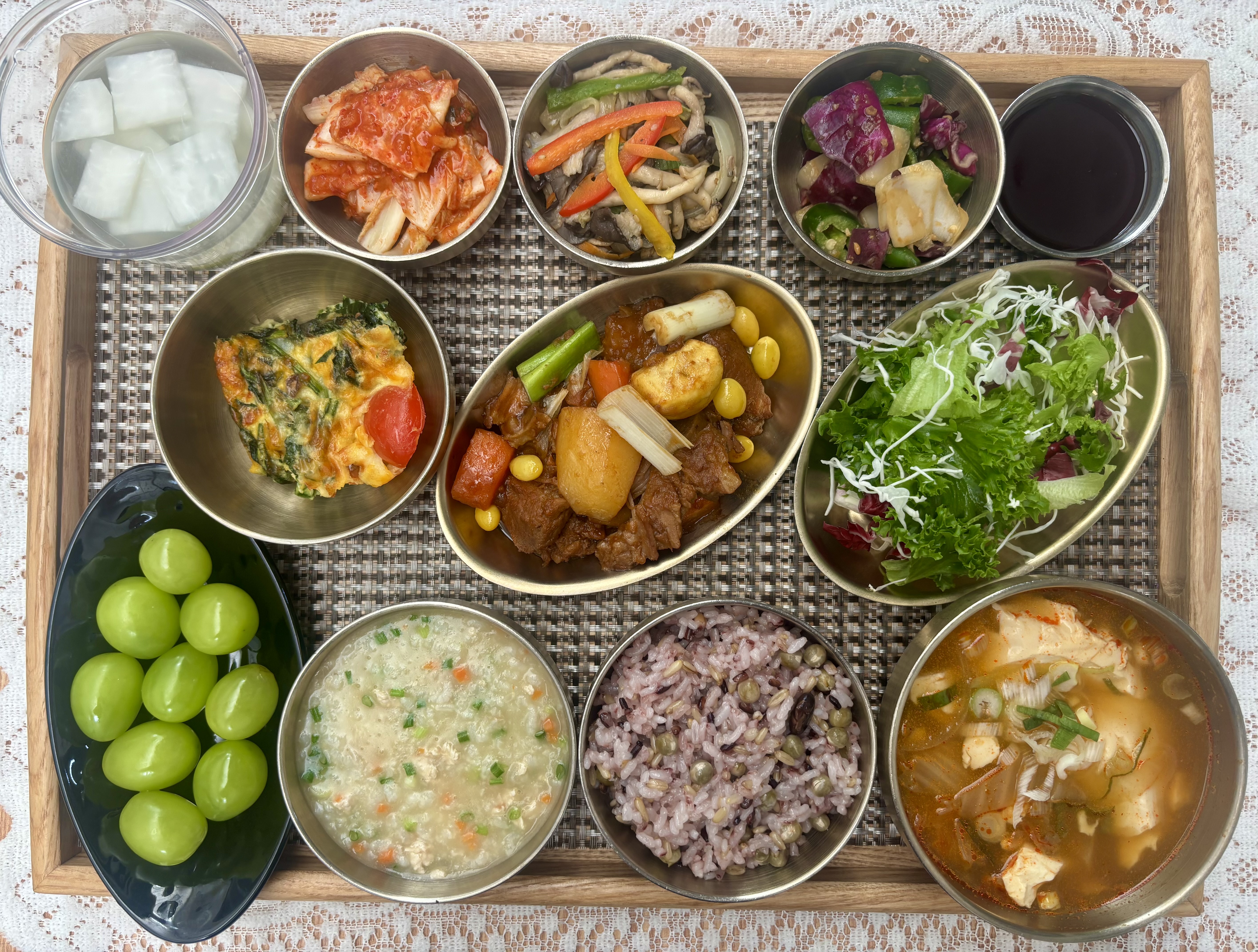 잡곡밥/영양죽/순두부찌개/한방돈갈비찜/시금치프리타타/느타리버섯볶음/아삭고추된장무침/라디치오샐러드&드레싱/포기김치/나박김치/계절과일