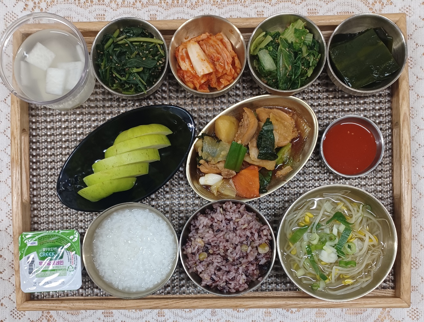 잡곡밥/죽/콩나물국/순살찜닭/쌈다시마&초장/취나물볶음/얼갈이된장나물/포기김치/나박김치/누룽지/사과/계란/요거트