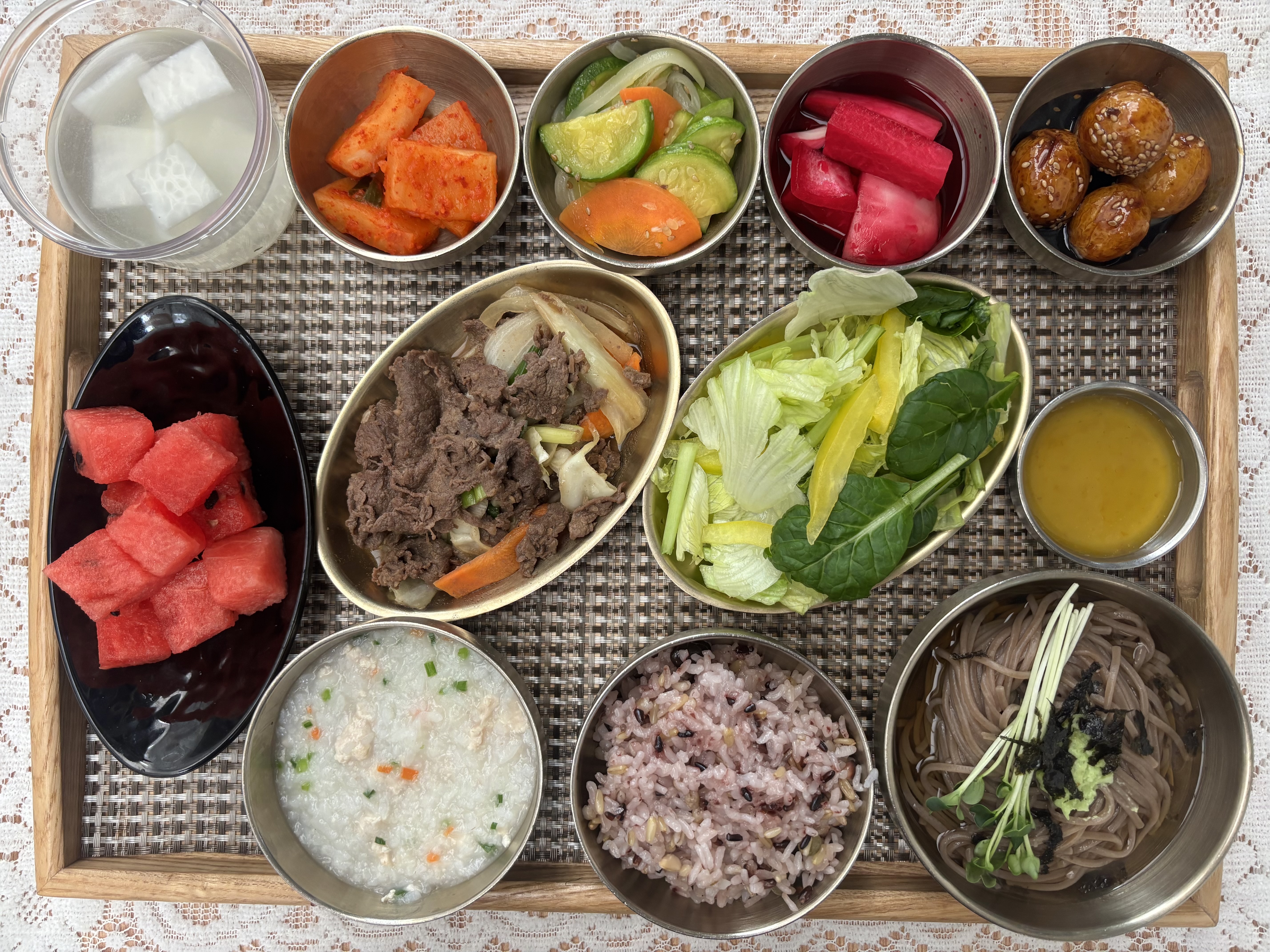 잡곡밥/영양죽/냉모밀/소불고기/알감자조림/호박나물/비트피클/그린샐러드&드레싱/포기김치/나박김치/계절과일