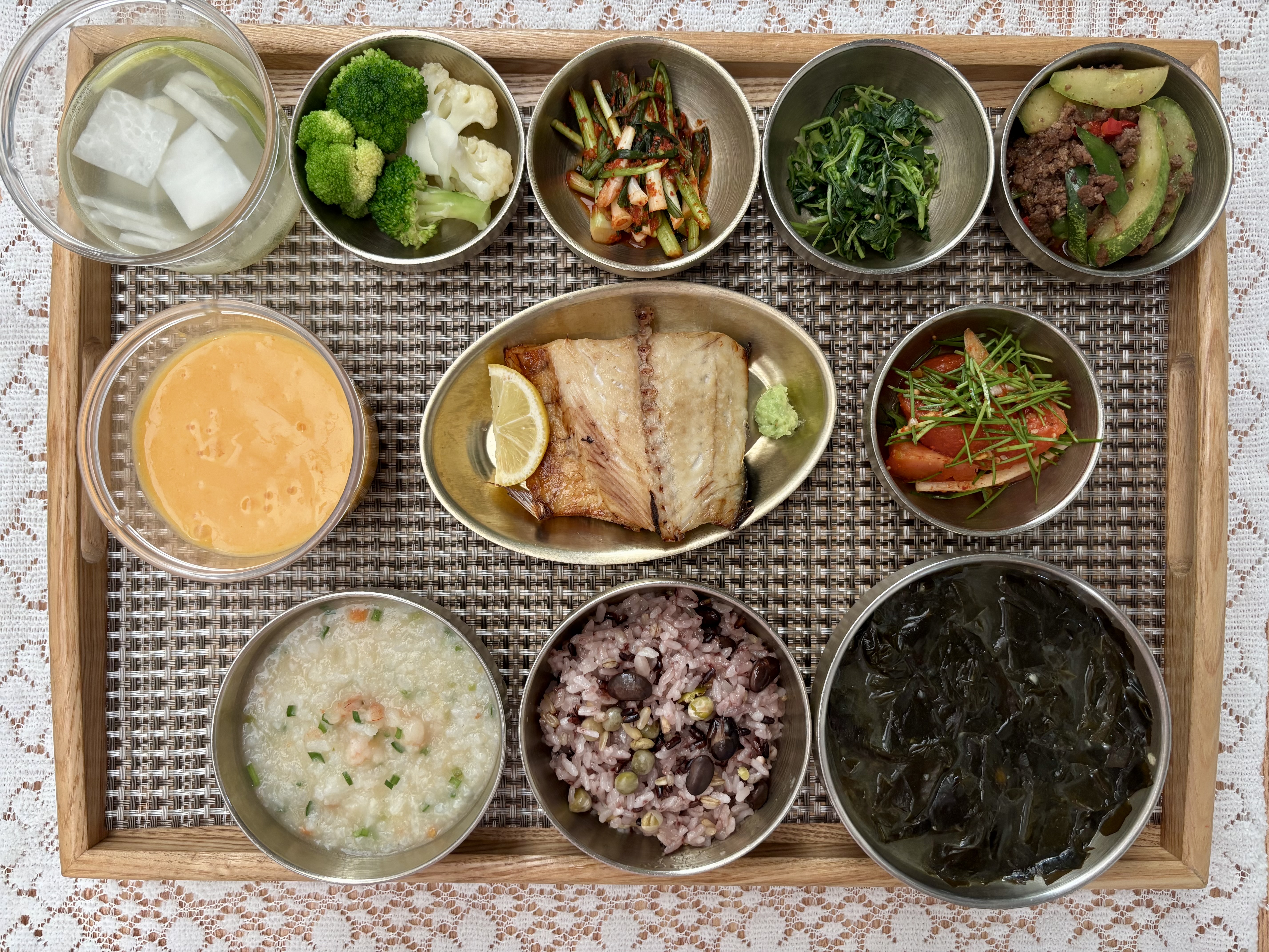잡곡밥/영양죽/미역국/삼치구이&와사비/소고기오이볶음/비름나물/토마토겉절이/파김치/나박김치/브로컬러&컬리/홍시요거트스무디