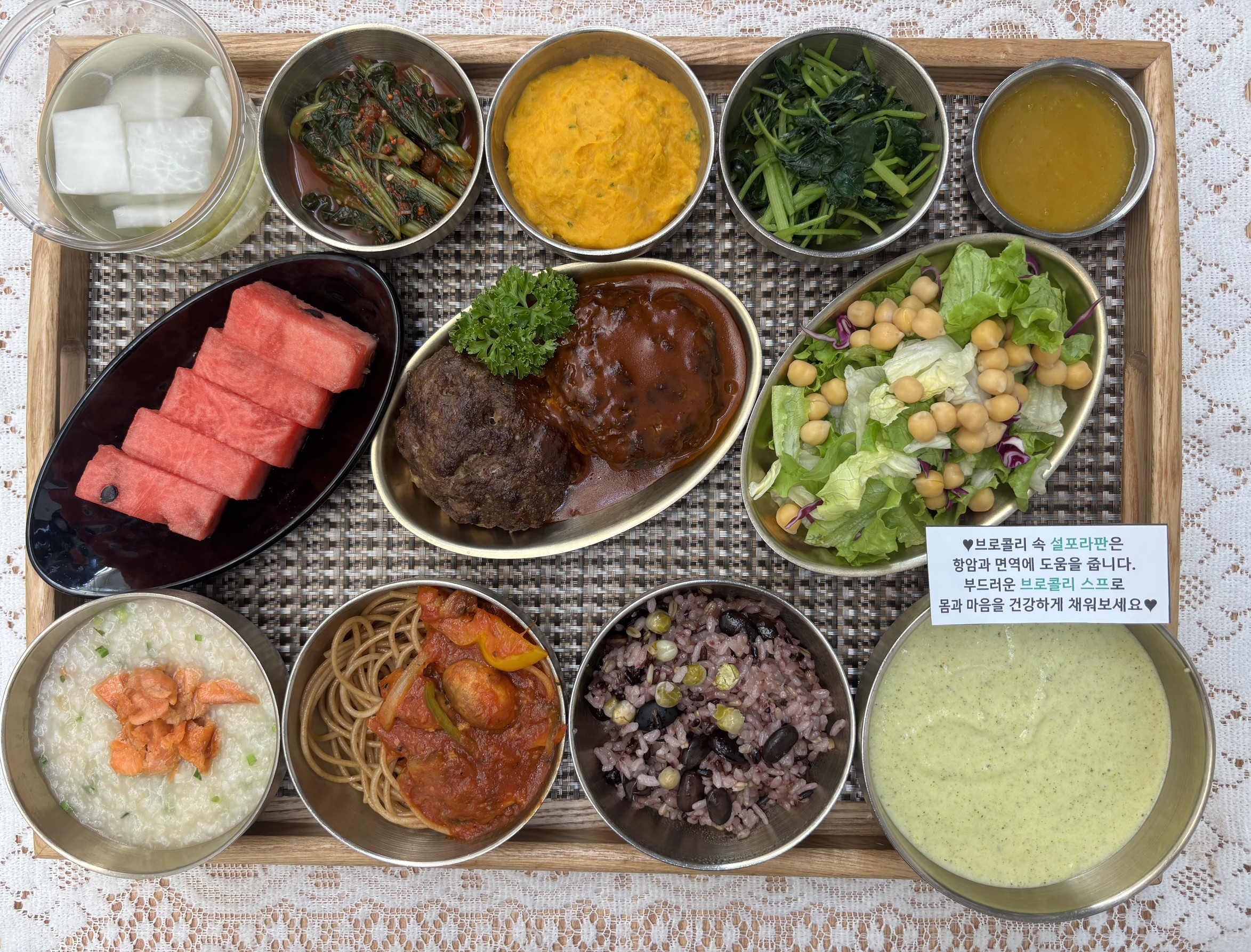 잡곡밥/영양죽/브로컬리스프/함박스테이크&소스/통밀면토마토파스타/고구마단호박샐러드/참나물/병아리콩샐러드&드레싱/갓김치/나박김치/계절과일
