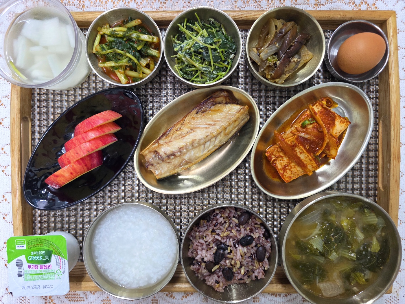 잡곡밥/죽/얼갈이된장국/고등어구이/두부조림/가지볶음/들깨취나물/열무김치/나박김치/누룽지/사과/계란/요거트