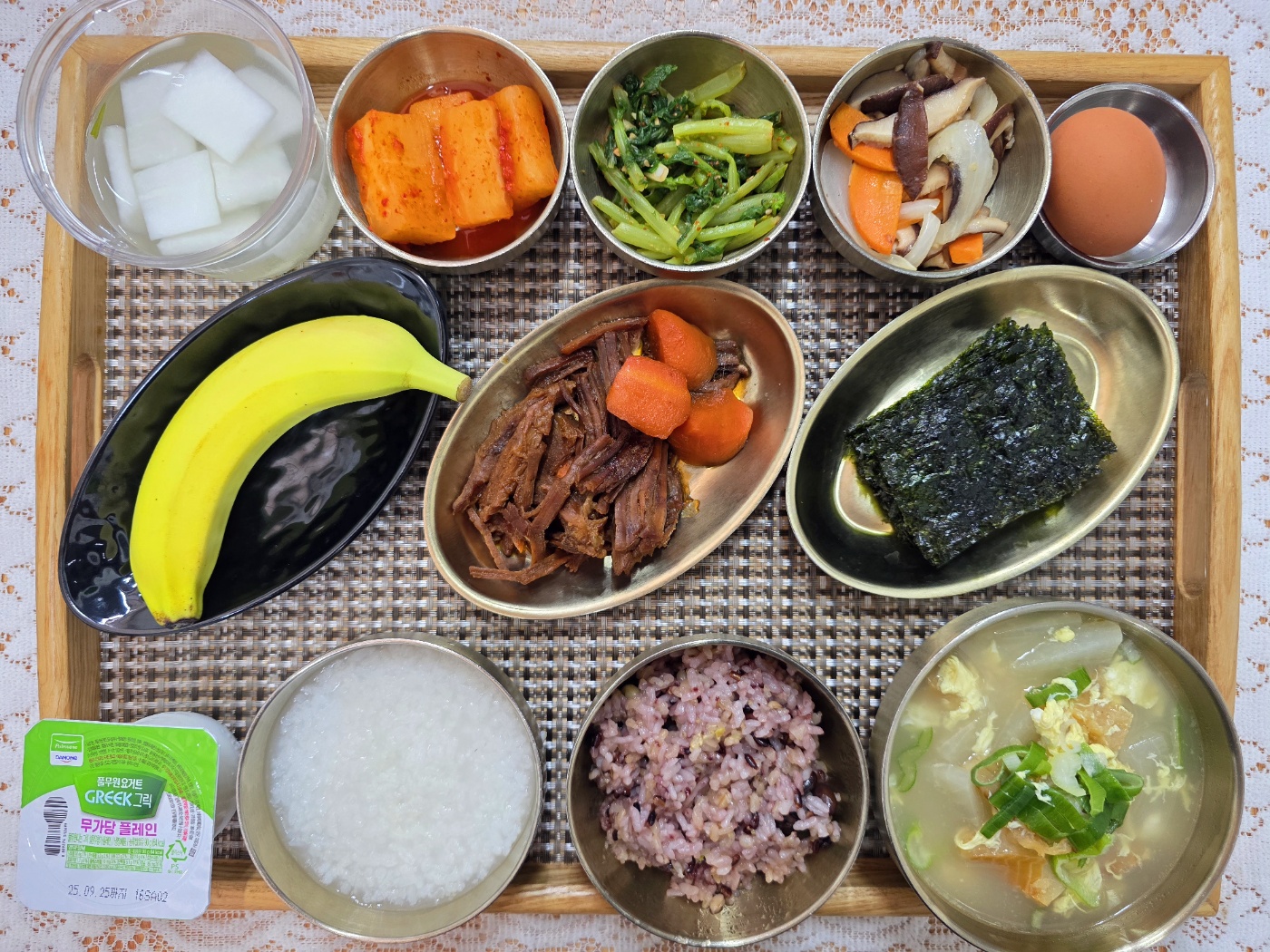 잡곡밥/죽/황태무국/소고기장조림/표고버섯볶음/들기름김/열무된장나물/석박지/나박김치/누룽지/바나나/계란/요거트