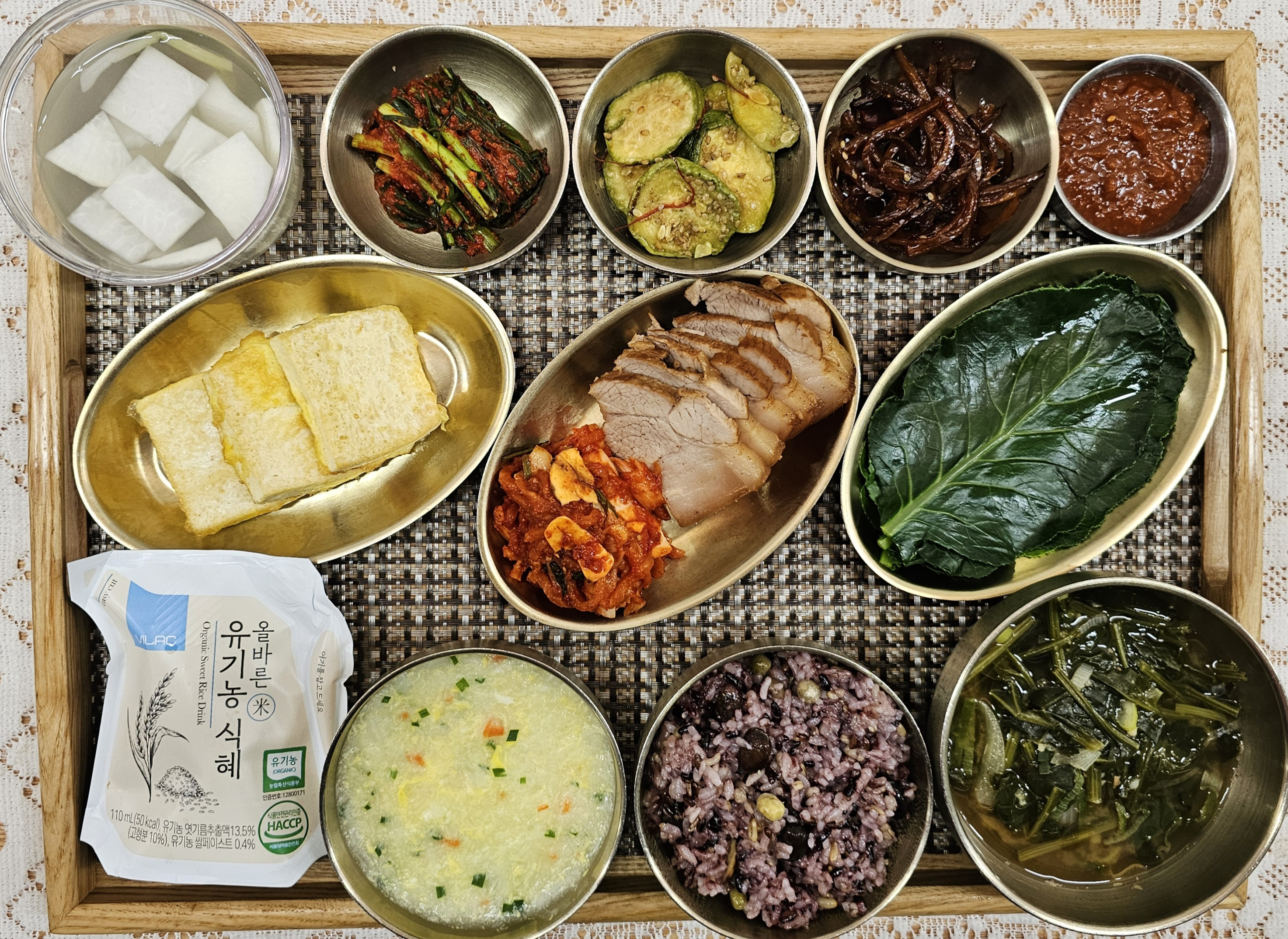 잡곡밥/영양죽/시금치된장국/수육&보쌈김치/두부계란구이/우엉채조림/건호박나물/파김치/나박김치/숙케일&쌈장/유기농식혜