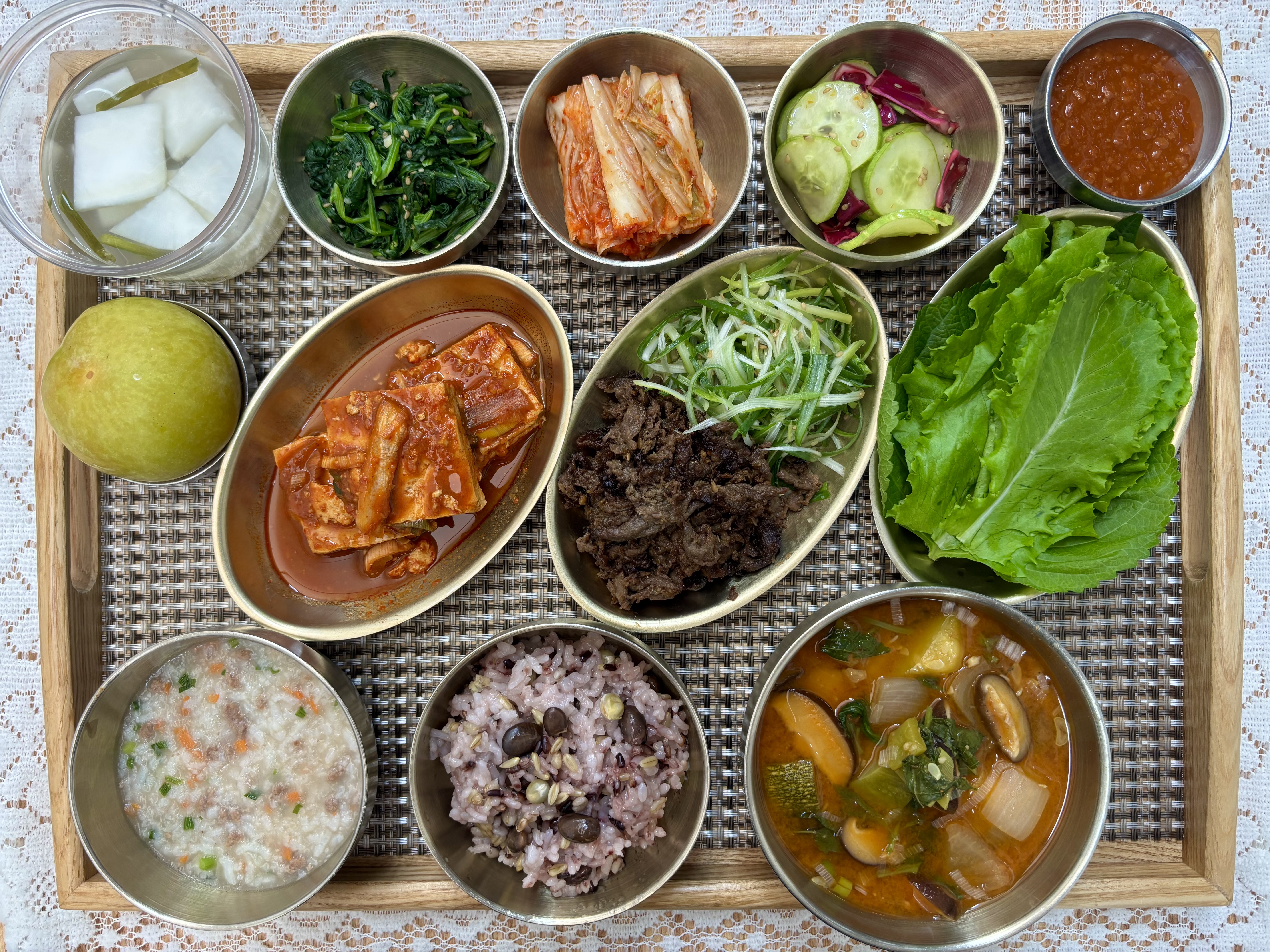 잡곡밥/영양죽/감자고추장찌개/바싹불고기&파채무침/두부조림/시금치나물/오이유자무침/쌈채소&쌈장/포기김치/나박김치/계절과일