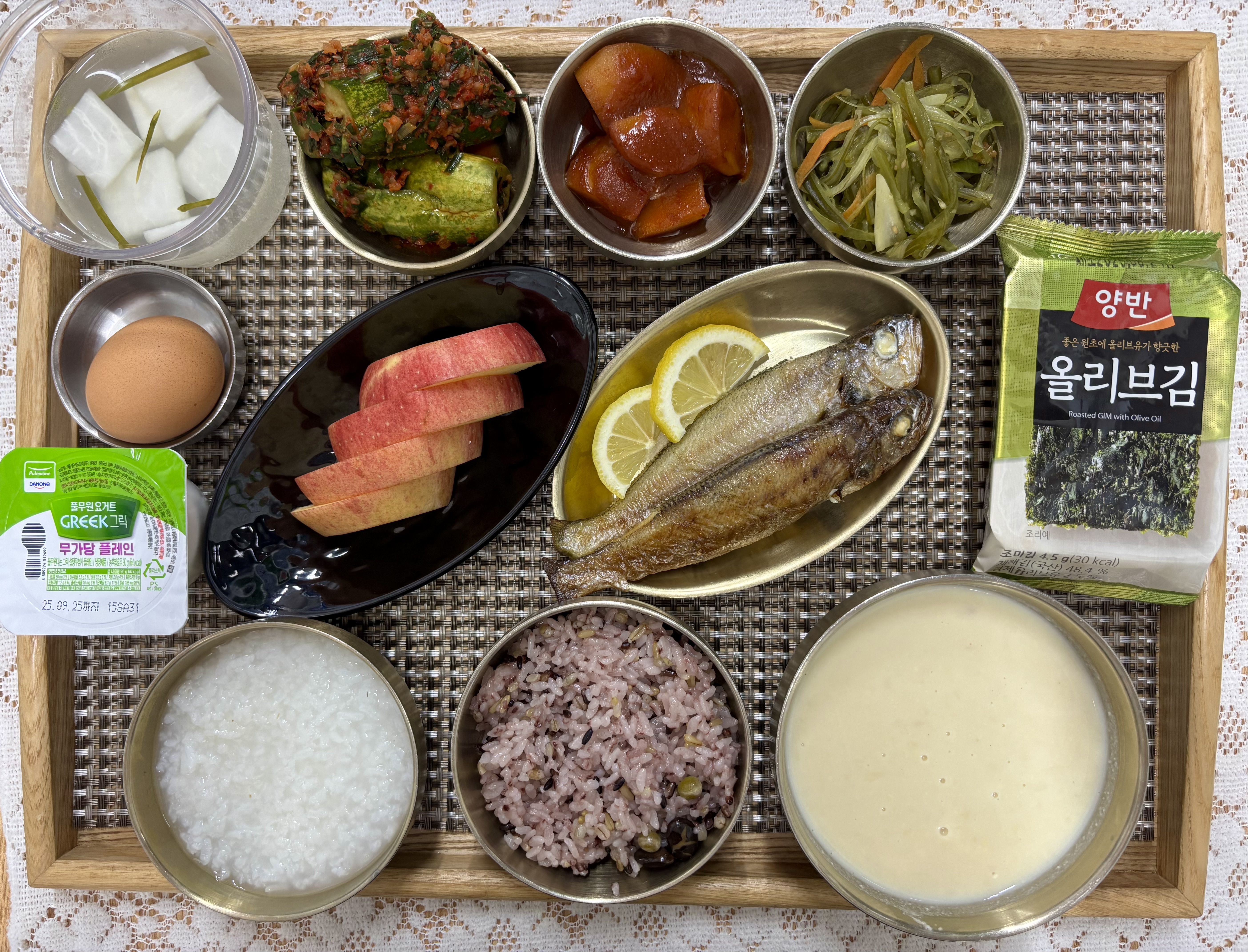 잡곡밥/죽/콩비지백탕/굴비구이/매콤감자조림/미역줄기볶음/들기름김/오이소박이/나박김치/사과/계란/요거트
