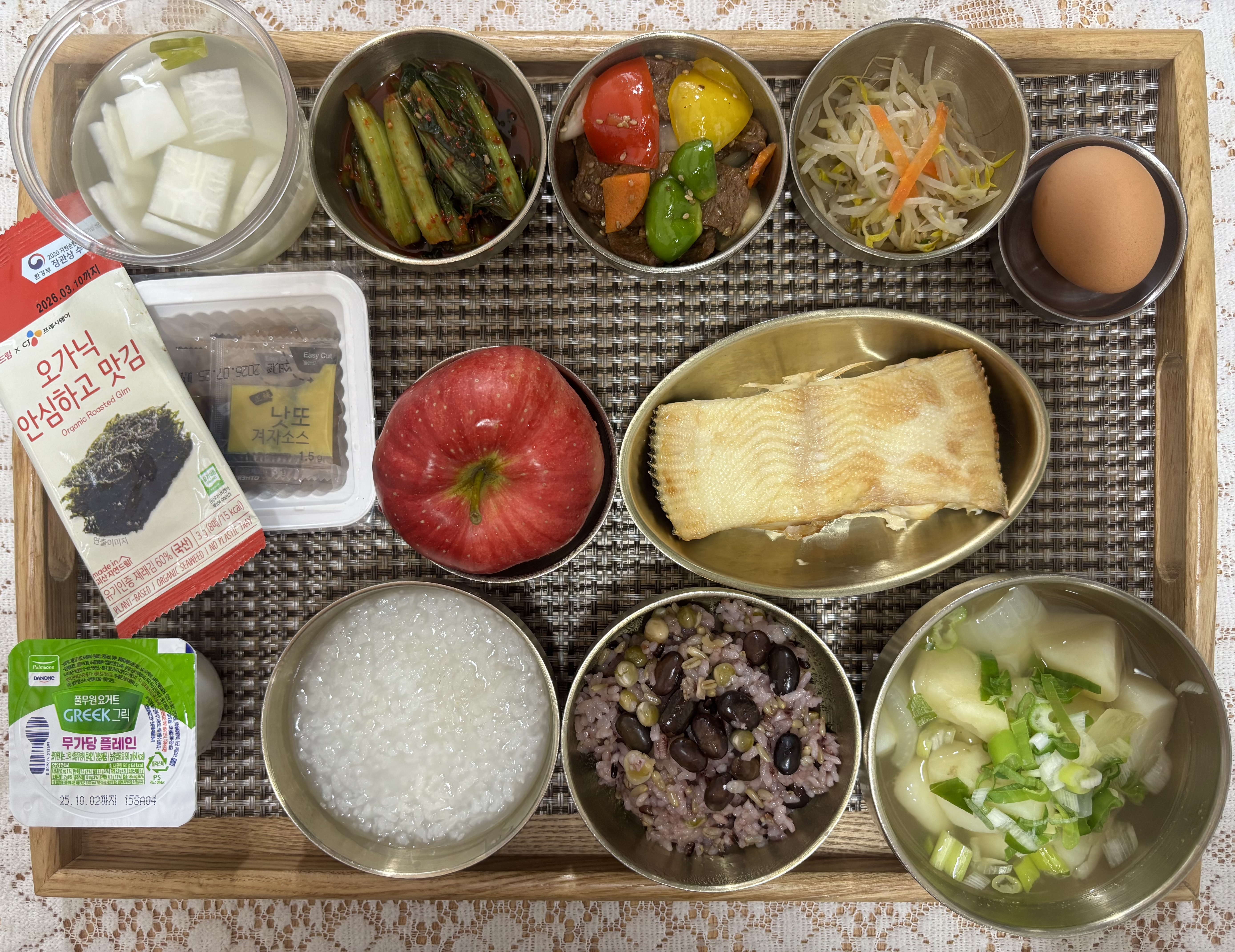 잡곡밥/죽/감자국/가자미구이/콩고기볶음/낫또&김/숙주나물/갓김치/나박김치/사과/계란/요거트