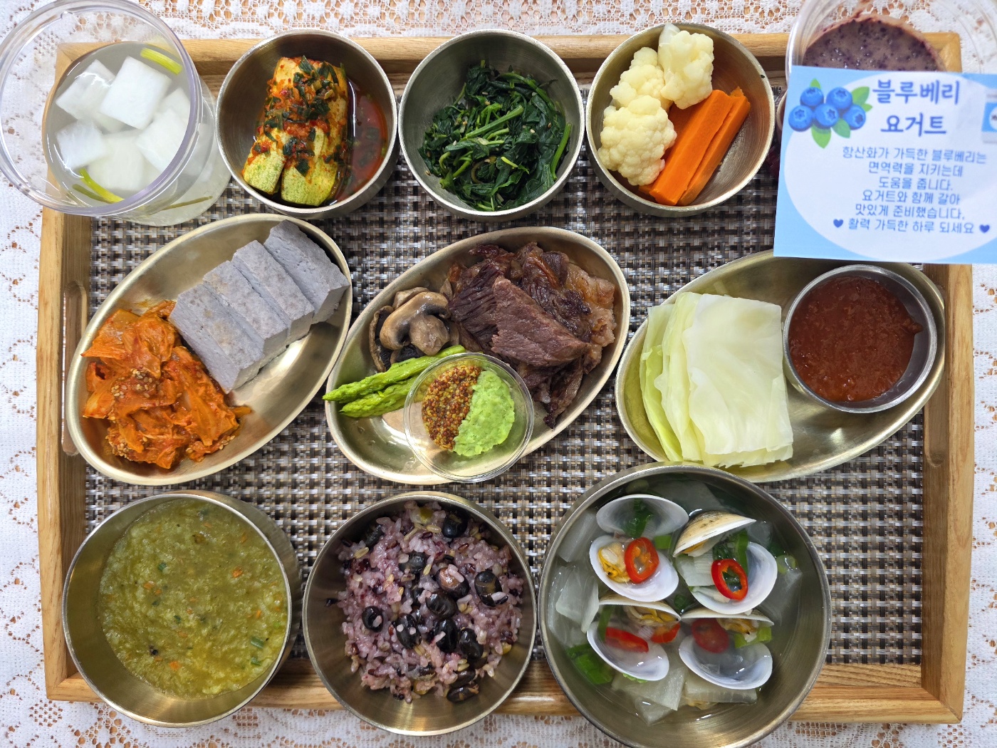 잡곡밥/영양죽/모시조개탕/와규구이/서리태온두부&볶음김치/양배추쌈/고춧잎나물/오이소박이/나박김치/숙당근&숙컬리플라워/수제블루베리요거트