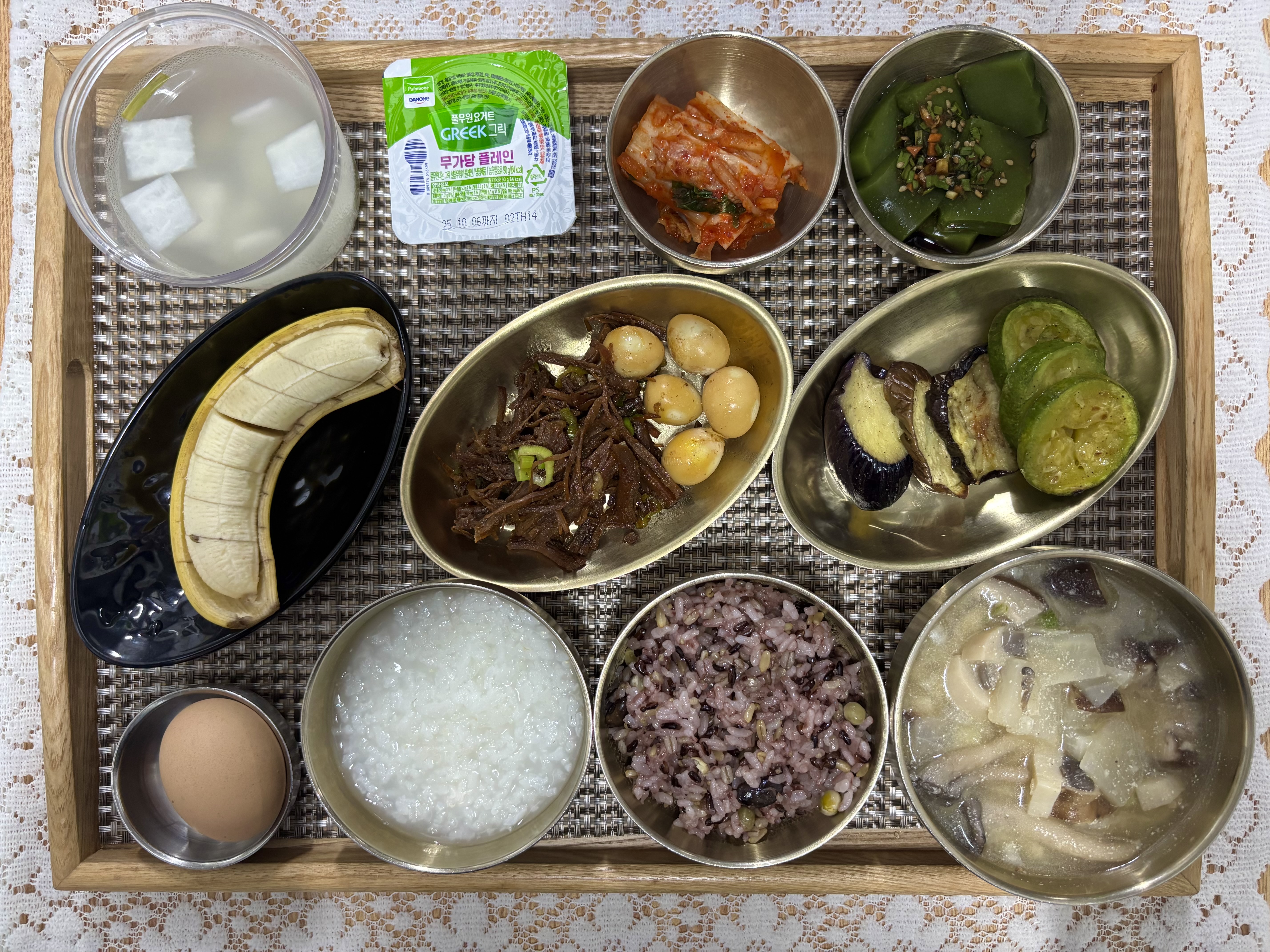 잡곡밥/죽/버섯들깨탕/소고기장조림/애호박&가지구이/클로렐라묵&양념장/고춧잎나물/포기김치/나박김치/바나나/계란/요거트