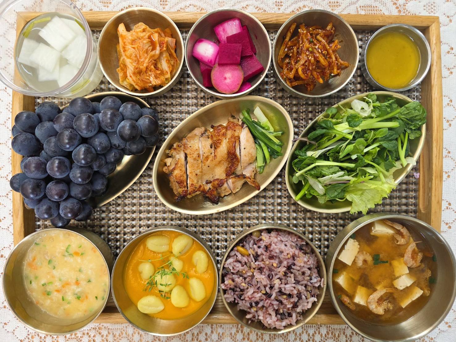 잡곡밥/영양죽/건새우미소장국/닭다리살허브구이/단호박퓨레뇨끼/진미채볶음/수제비트피클/그린샐러드&드레싱/포기김치/나박김치/계절과일