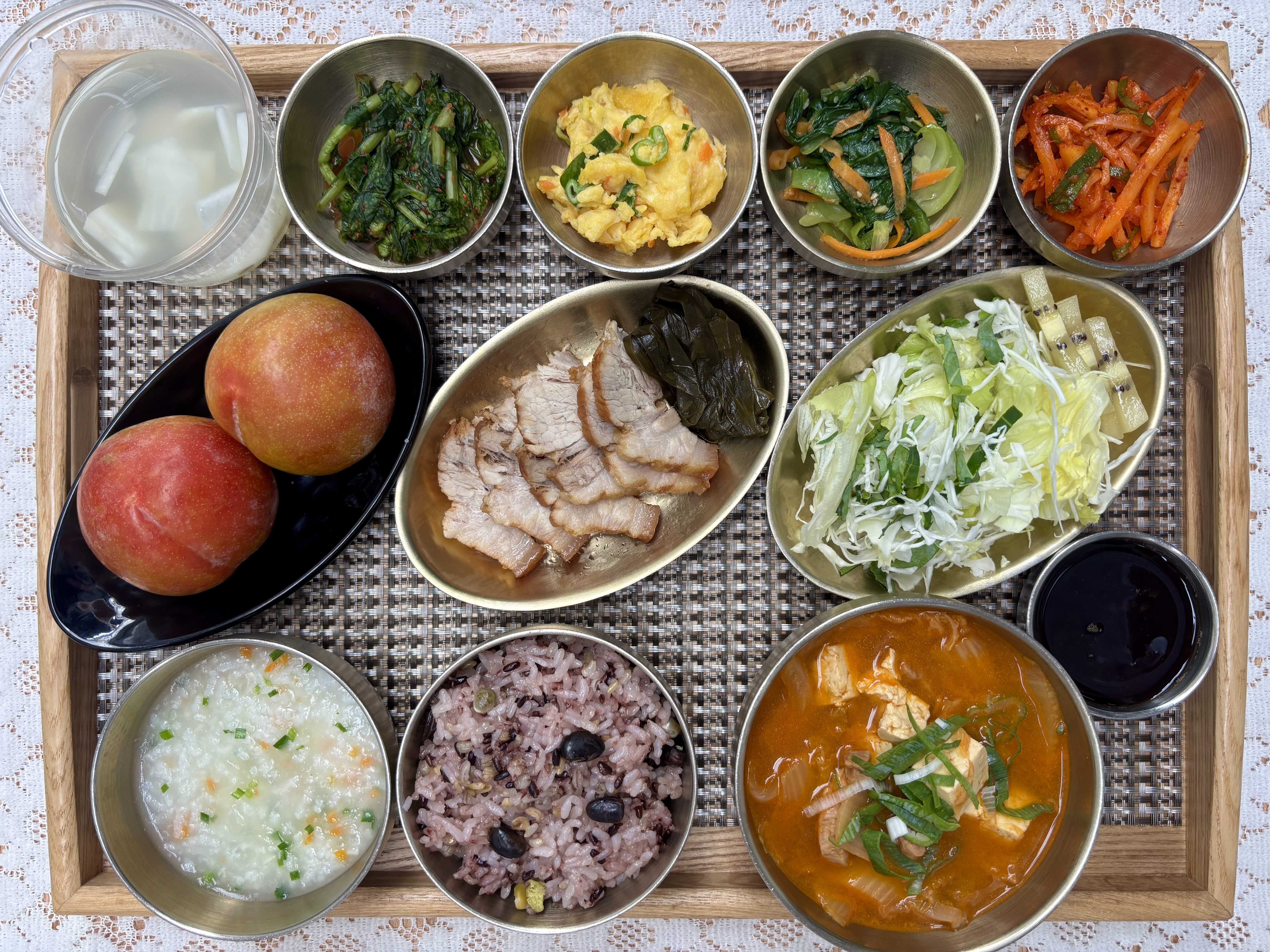 잡곡밥/영양죽/김치찌개/수육&명이장아찌/스크램블에그/청경채볶음/도라지생채/키위샐러드&드레싱/열무김치/나박김치/계절과일