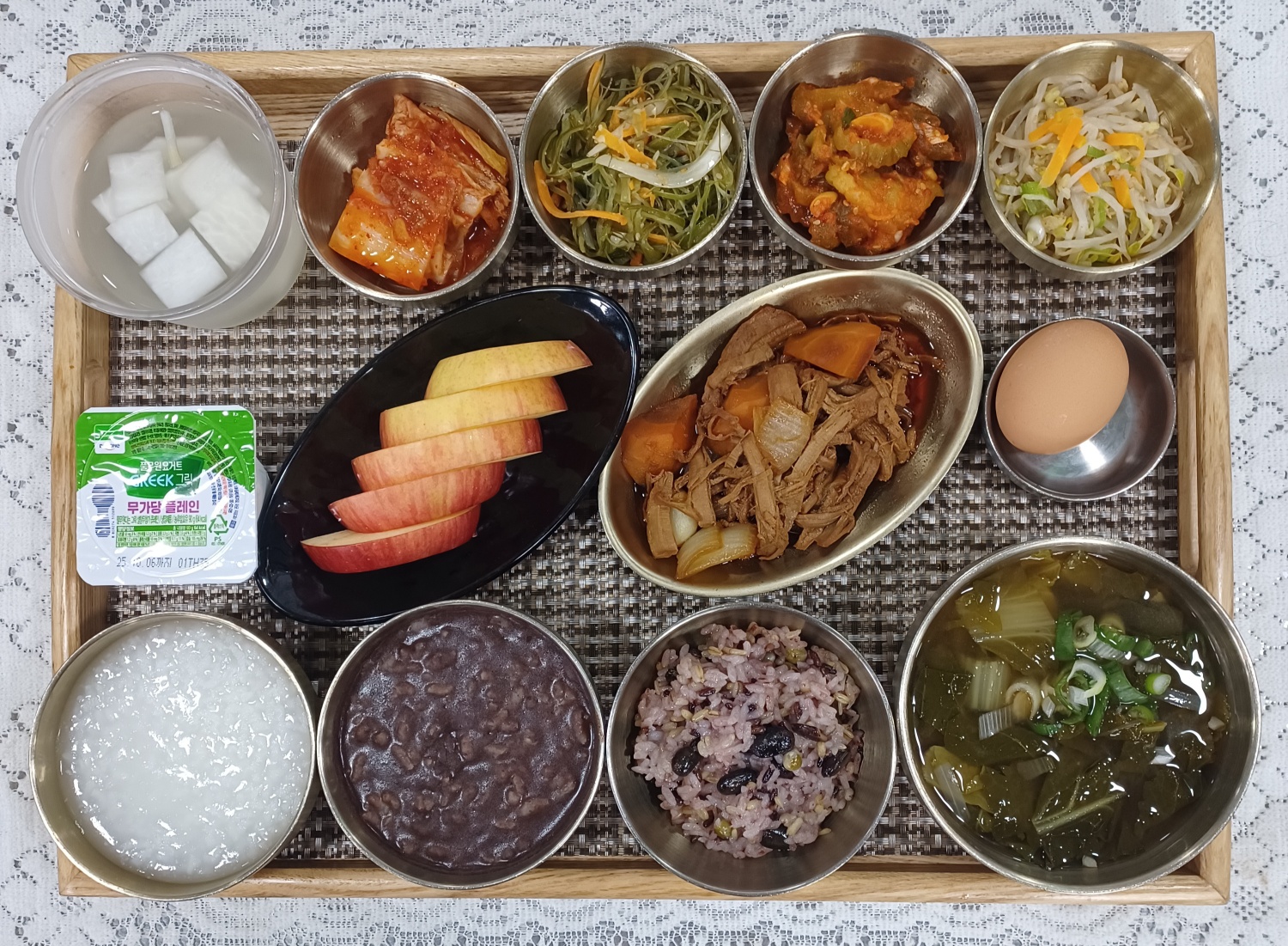 잡곡밥/죽/팥죽/얼갈이된장국/돈안심장조림/미역줄기볶음/숙주나물/오이지무침/포기김치/나박김치/사과/계란/요거트