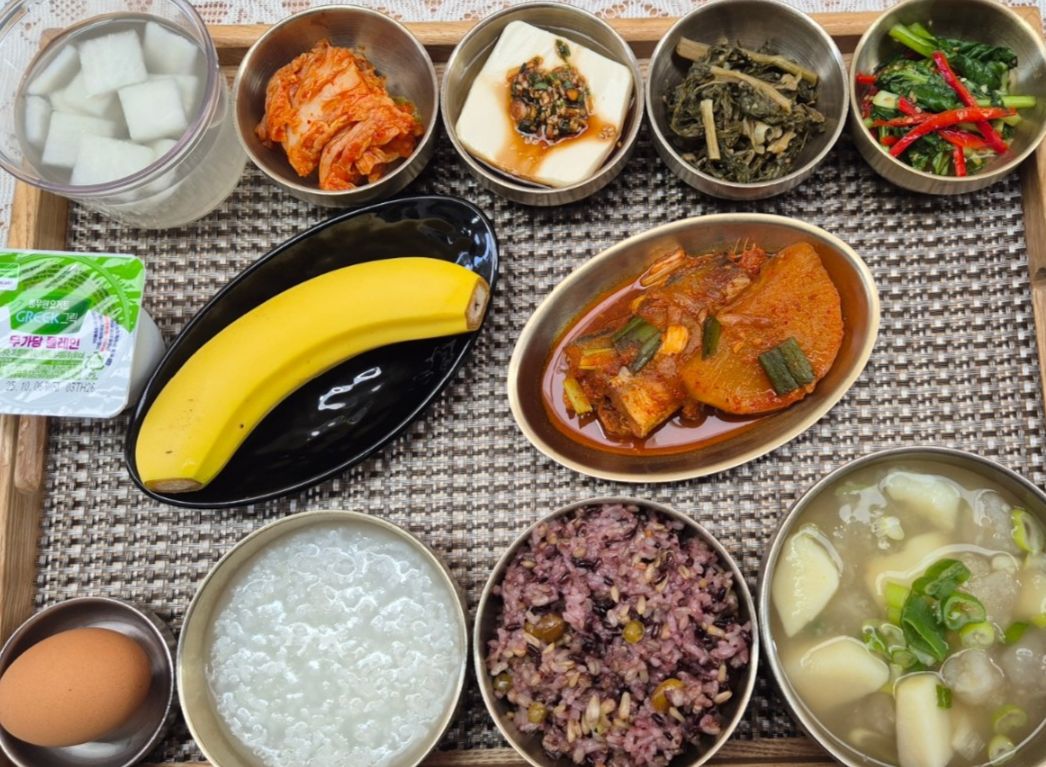 잡곡밥/죽/감자옹심이국/코다리찜/연두부&간장/시래기된장지짐/비타민유자무침/포기김치/나박김치/바나나/계란/요거트
