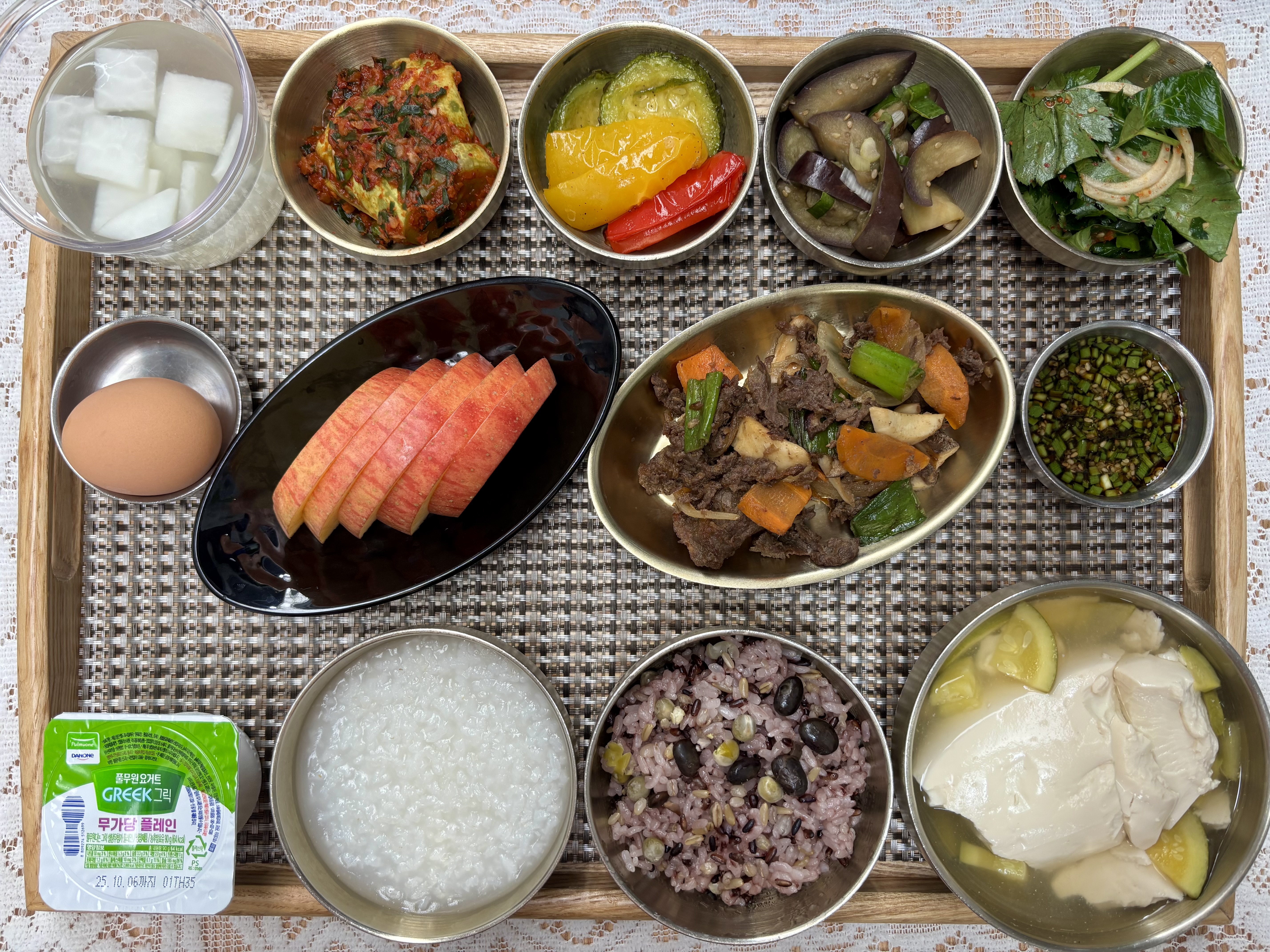잡곡밥/죽/순두부백탕/한우불고기/애호박&파프리카구이/가지나물/참나물생채/오이소박이/나박김치/사과/계란/요거트