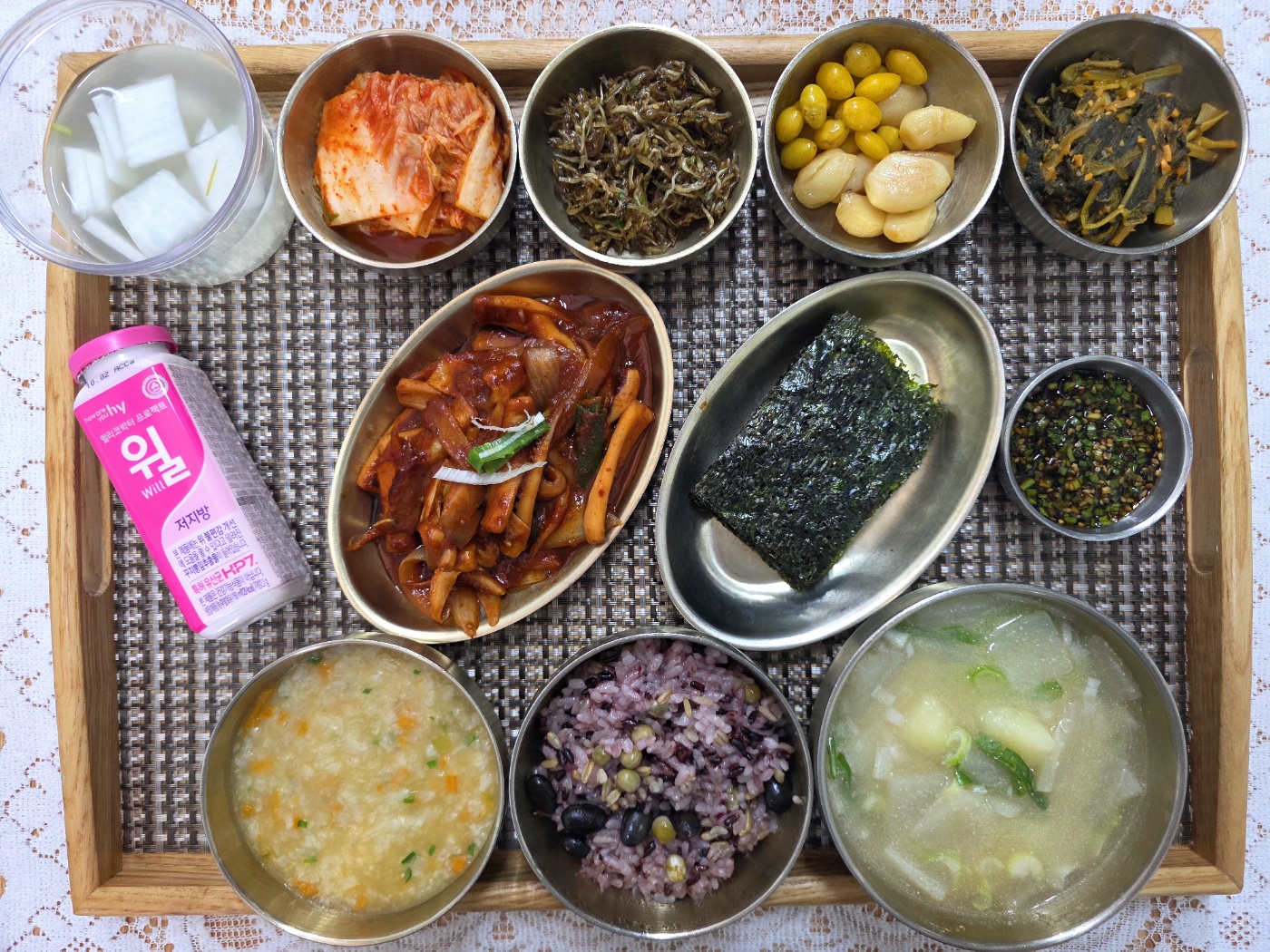 잡곡밥/영양죽/들깨감자국/오징어볶음/구이김&양념장/잔멸치조림/시래기된장지짐/포기김치/나박김치/숙은행&숙마늘/저지방윌