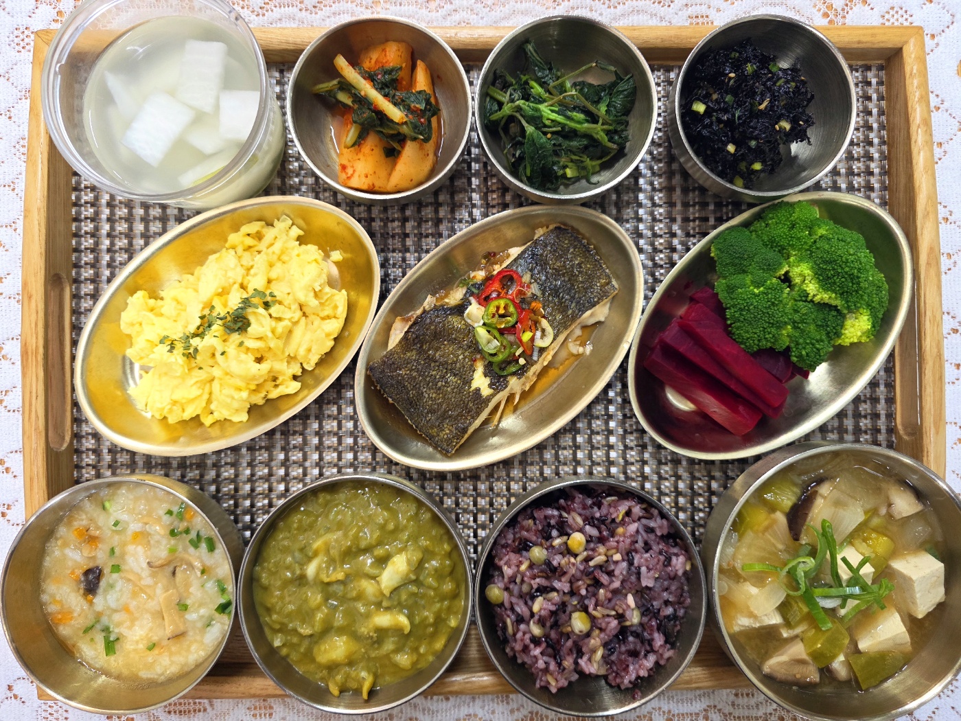 잡곡밥/영양죽/된장찌개/가자미구이&유린기소스/스크램블에그/건파래무침/깻순나물/알타리김치/나박김치/숙비트&숙브로컬리/전복죽